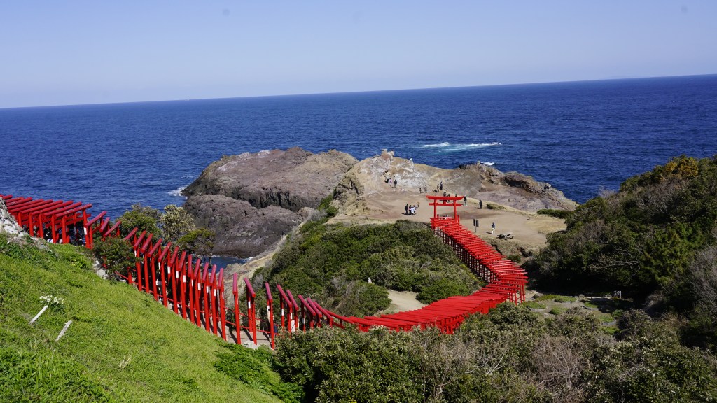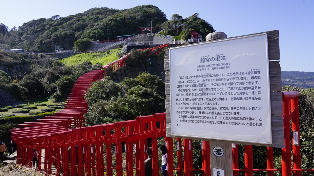 最讓人驚豔的地方,在於海景與鳥居相襯成趣。在藍天碧海與123座的紅色鳥居視覺延伸下,構成一幅美輪美奐景色天成的畫軸!不僅如此,若冬季造訪,另一種聽覺鼓動,聽海浪拍擊海蝕洞,形成如風櫃般巨響,稱為龍宮之潮吹!美國 CNN 評選為日本最美場所之一。