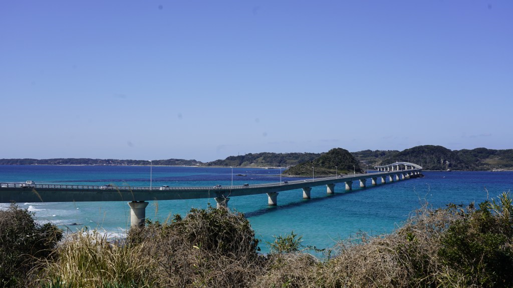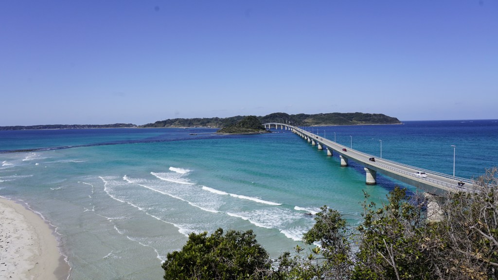 於2000年開通,全長 1780 米,橫跨日本本州與角島之間的唯一橋樑。筆直的大橋如巨龍橫臥在碧藍的大海之上,橋頭觀景台視角遼闊,潔淨的沙灘與清澈的藍海,海天共一色相當壯闊。