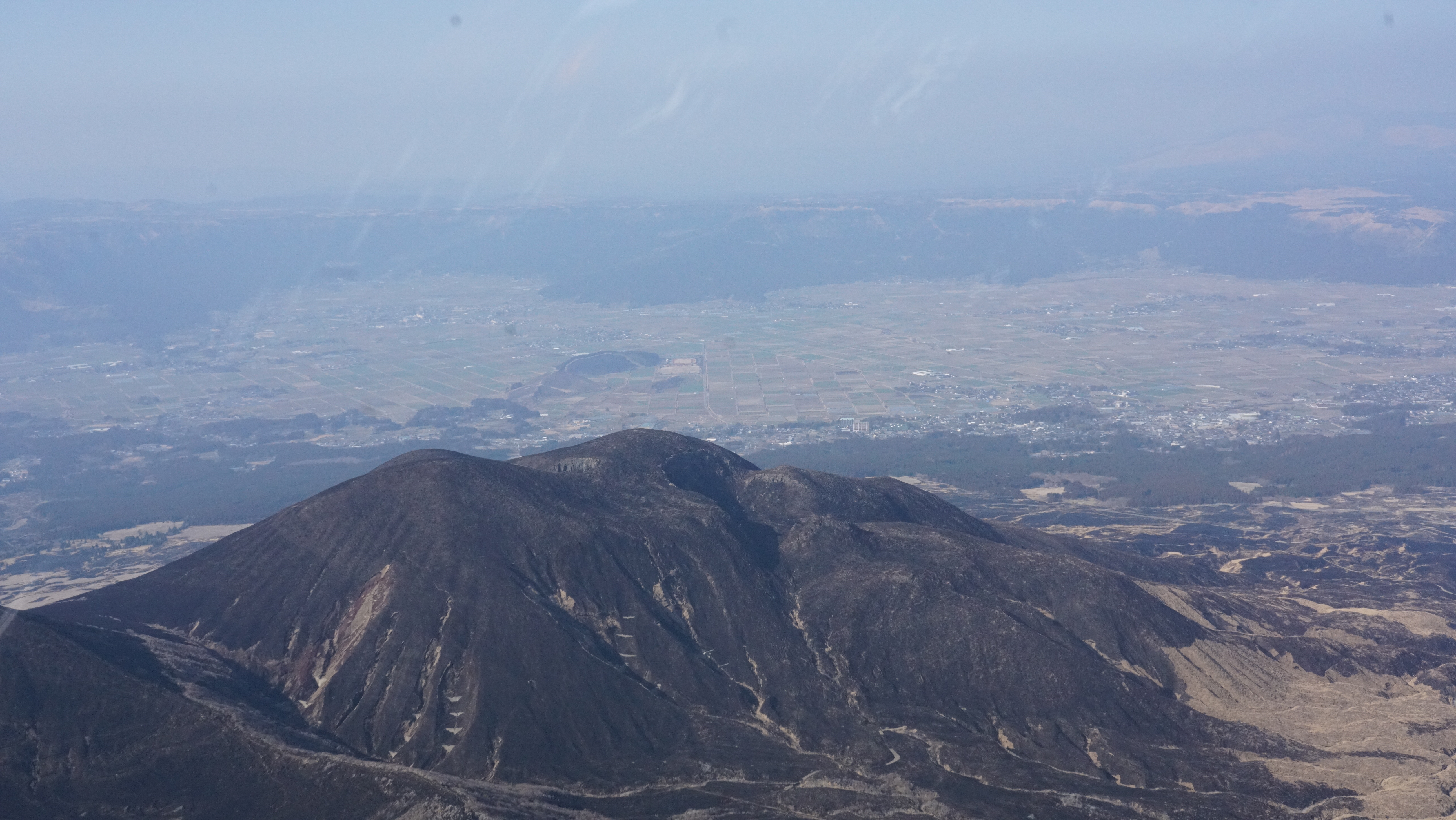 午餐後散步草千里,由於2月底已經放火燒山過,因此照片裡草千里景色一片墨醬色,不像夏天一望無際綠油油的美景,草場上馬群悠然自得,與藍天白雲相映成趣,美得像北國遼闊的大景,一切靜好!不時回望阿蘇中岳火山口,白煙嬝嬝,這趟重點是趕在3點40分搭乘直升機飛越阿蘇火山口,於是在停機坪花一萬日幣購票,全程約7分鐘低空飛越阿蘇火山群,包括:五岳-高岳、中岳、烏帽子岳、杵島岳、根子岳,以及俯瞰周邊火山地形-米塚、草千里等地形,雖然只有短短7分鐘,火山景色超級壯觀而震撼,鄰近的米塚,約是3000年前左右形成,算是比較新的火山噴發遺跡,環繞飛行一覽無遺,中岳活火山口至今還相當活耀不時噴發。