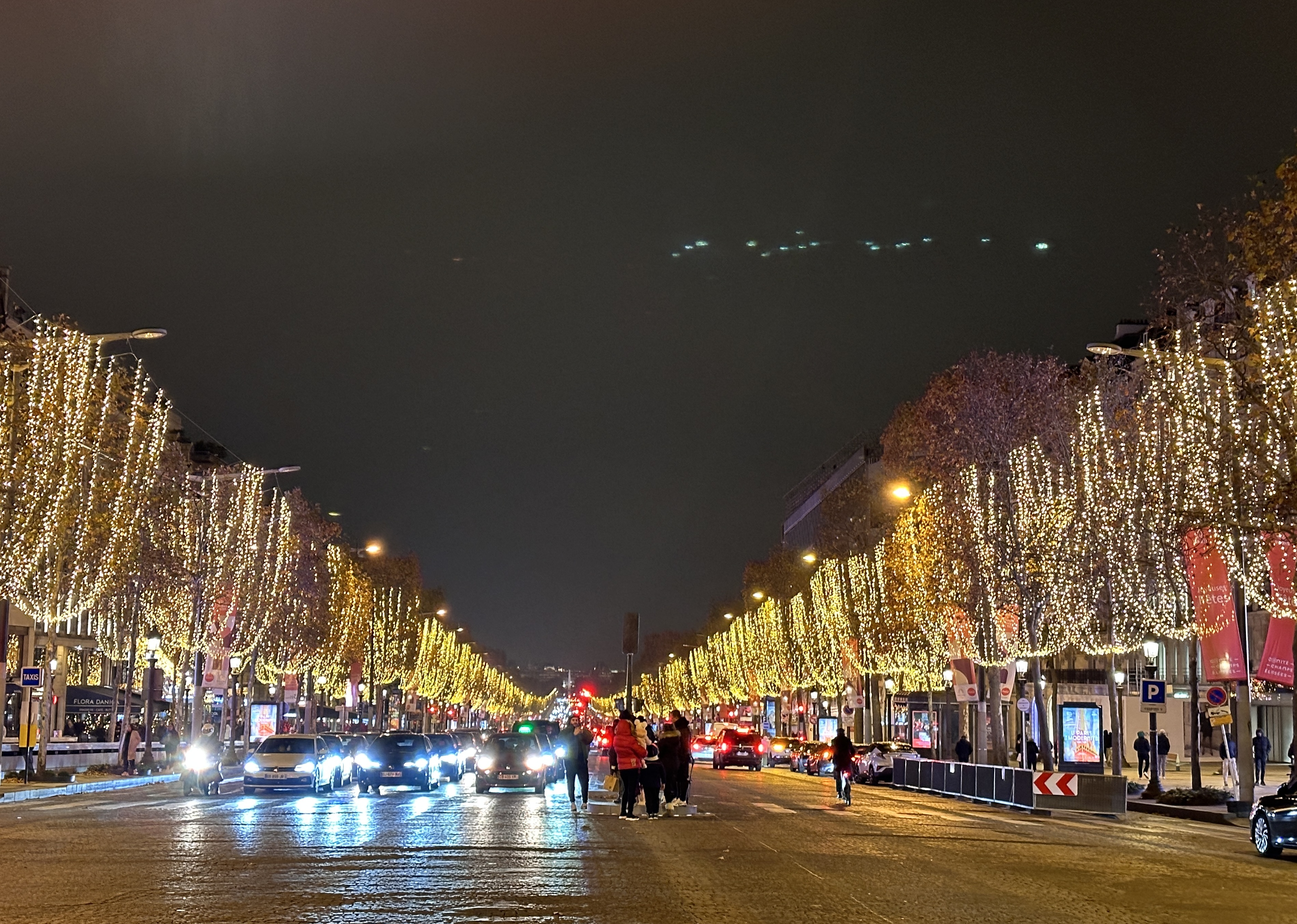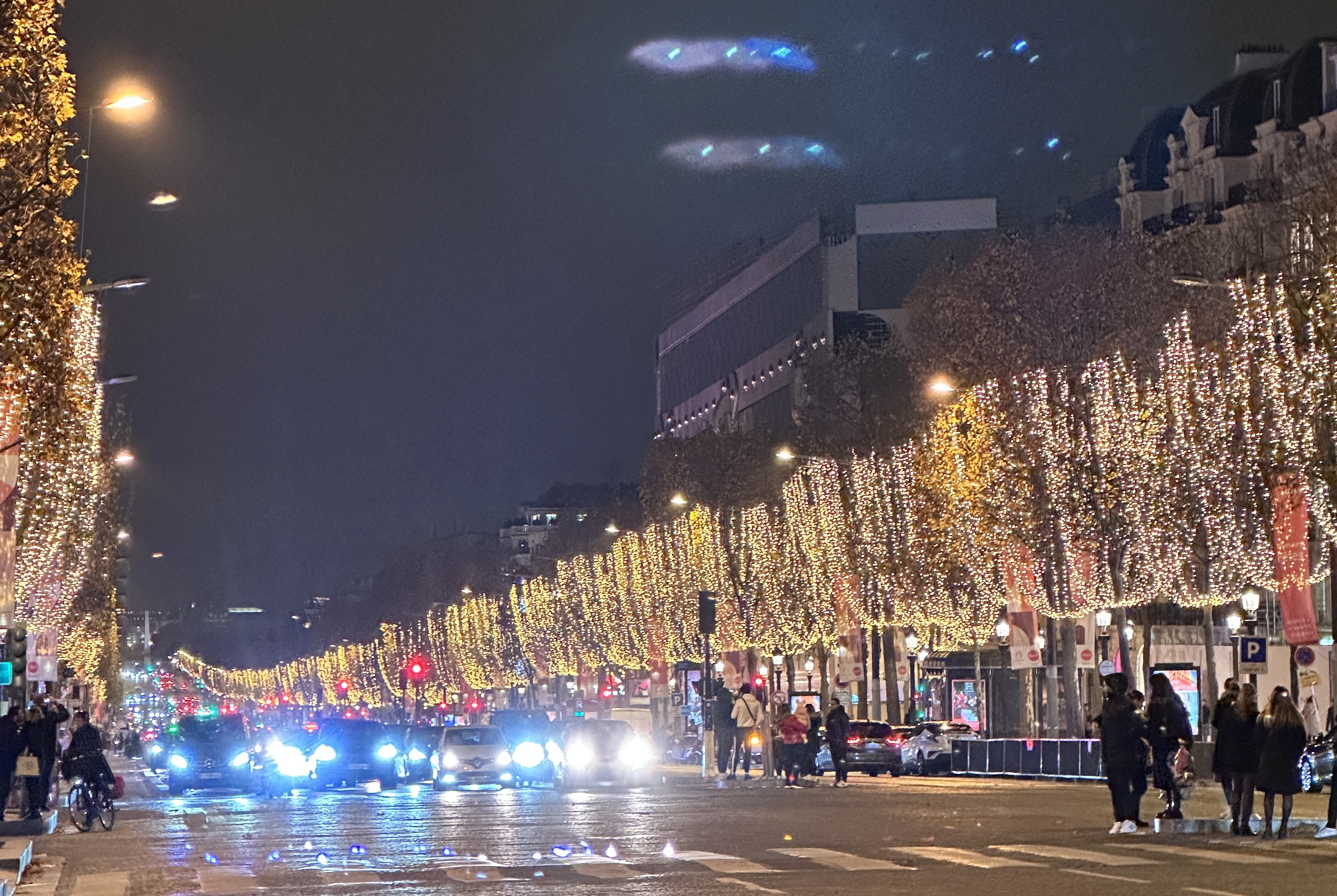 ▲華燈初上,香榭麗舍大道的行幹樹亮起一盞盞燈飾,造型似一排排香檳酒杯,璀璨的令人炫目。