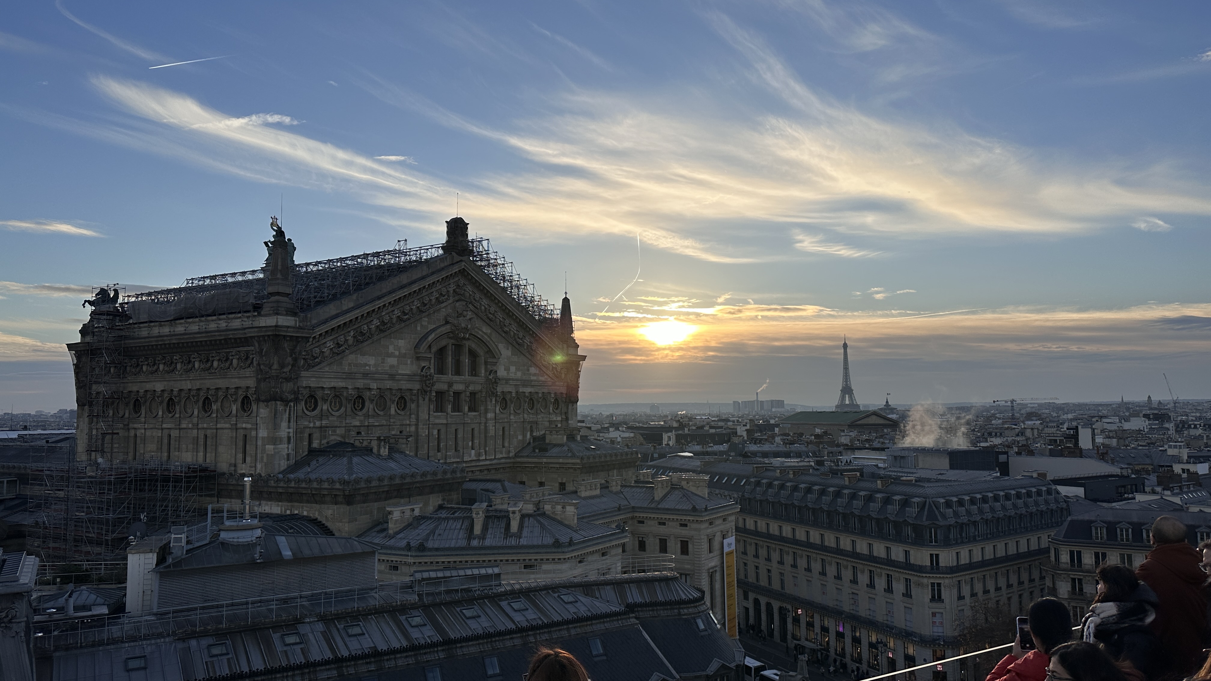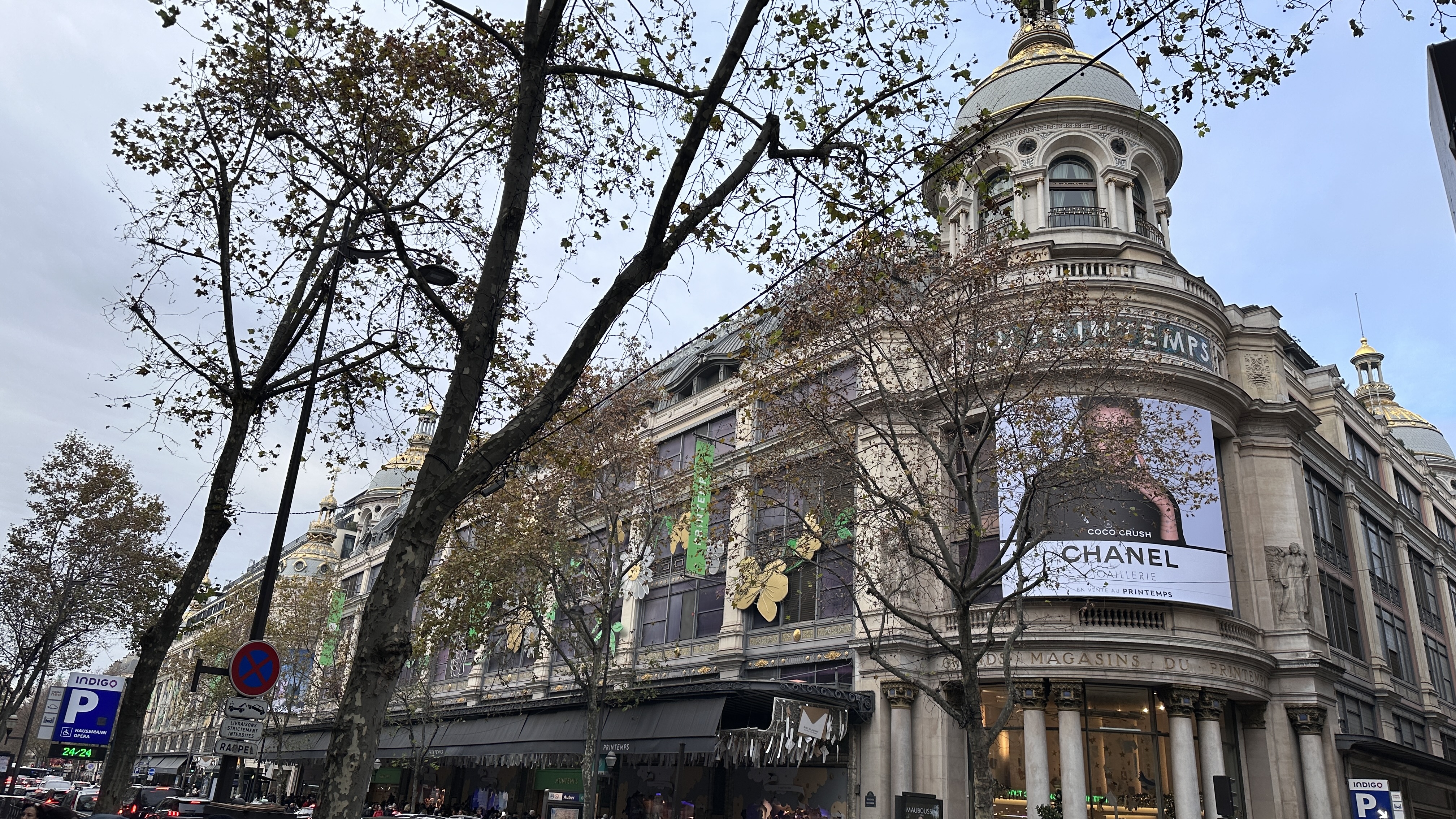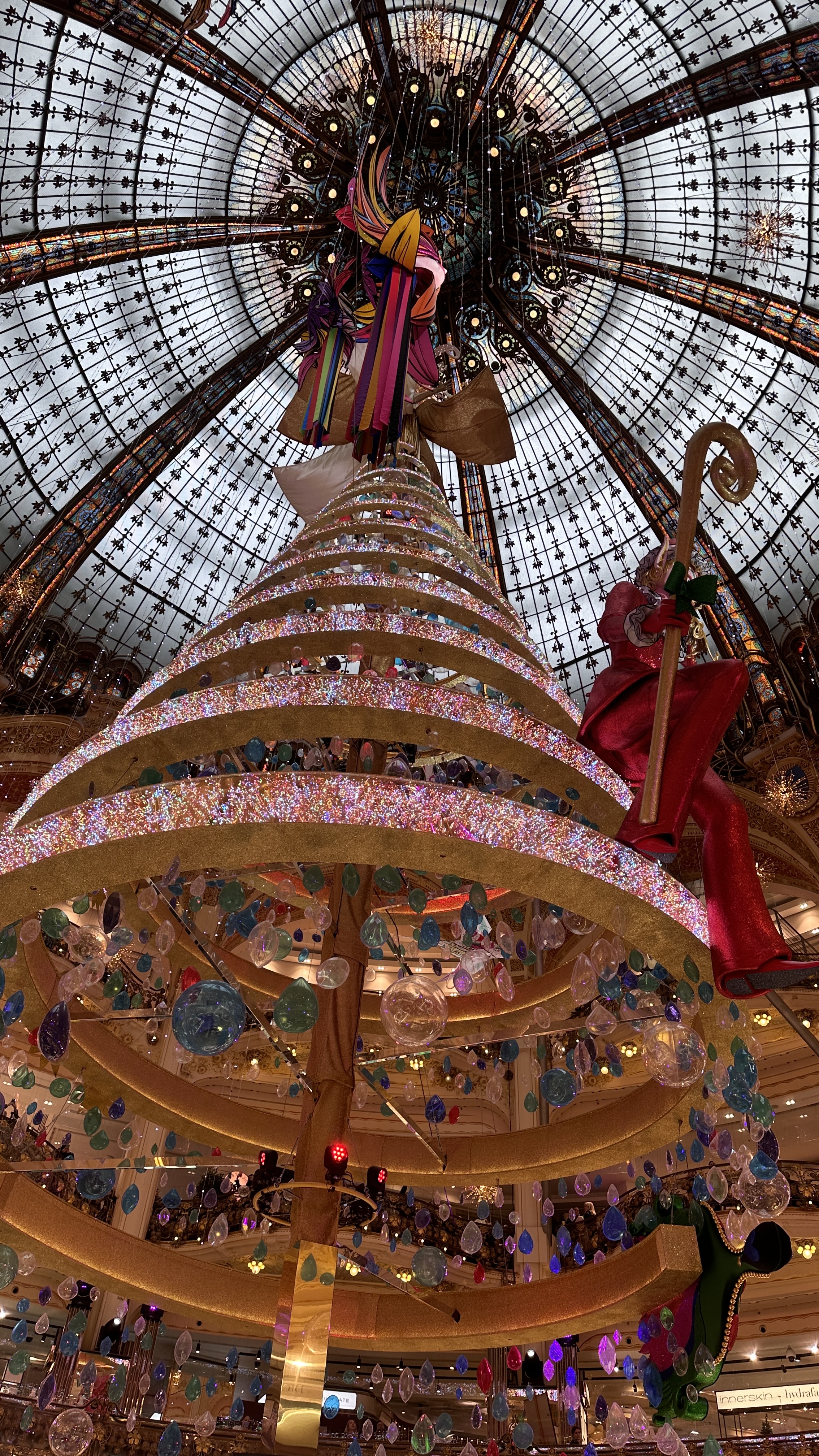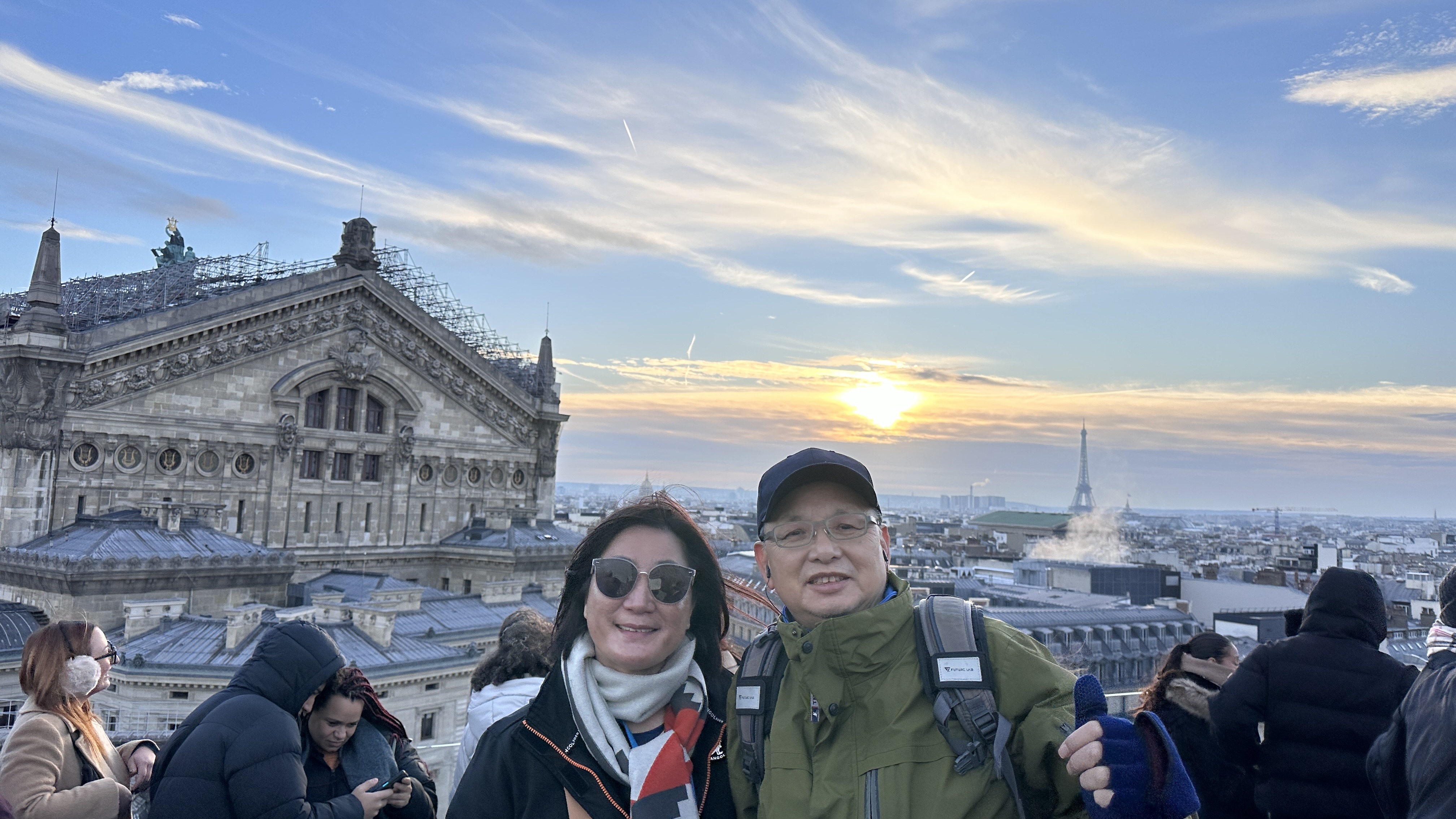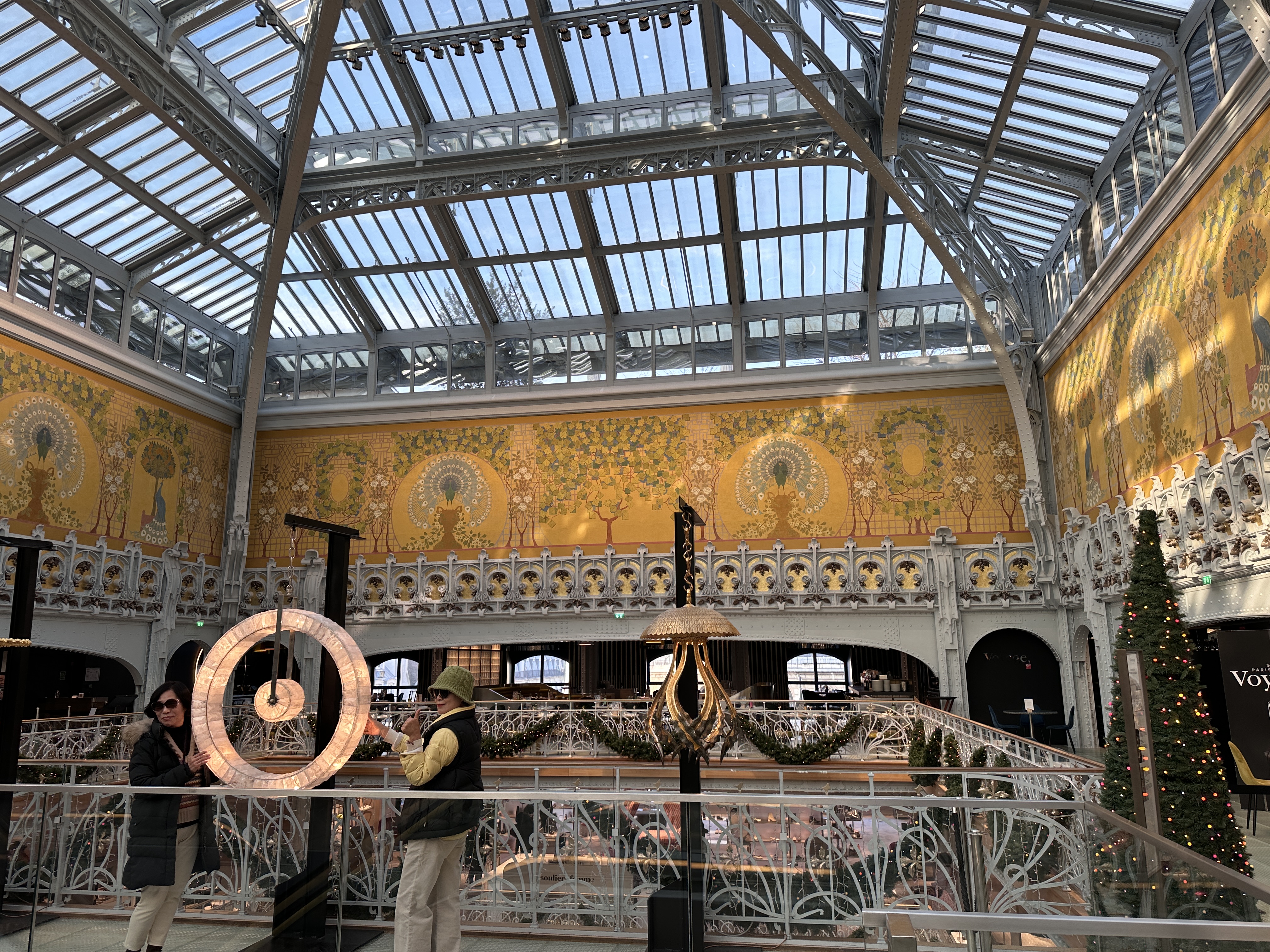 ▲拉法葉百貨公司:貴氣十足的拉法葉百貨,因音譯關係也被叫做「老佛爺百貨」。這座百貨公司建築屬新藝術風格,高達43米圓頂彩繪玻璃窗,聖誕燈飾特別華麗,其他團友血拚之際,我趁空檔上到頂樓露台眺望巴黎市景與近距離觀賞歌劇院的巴洛克屋頂!▼。