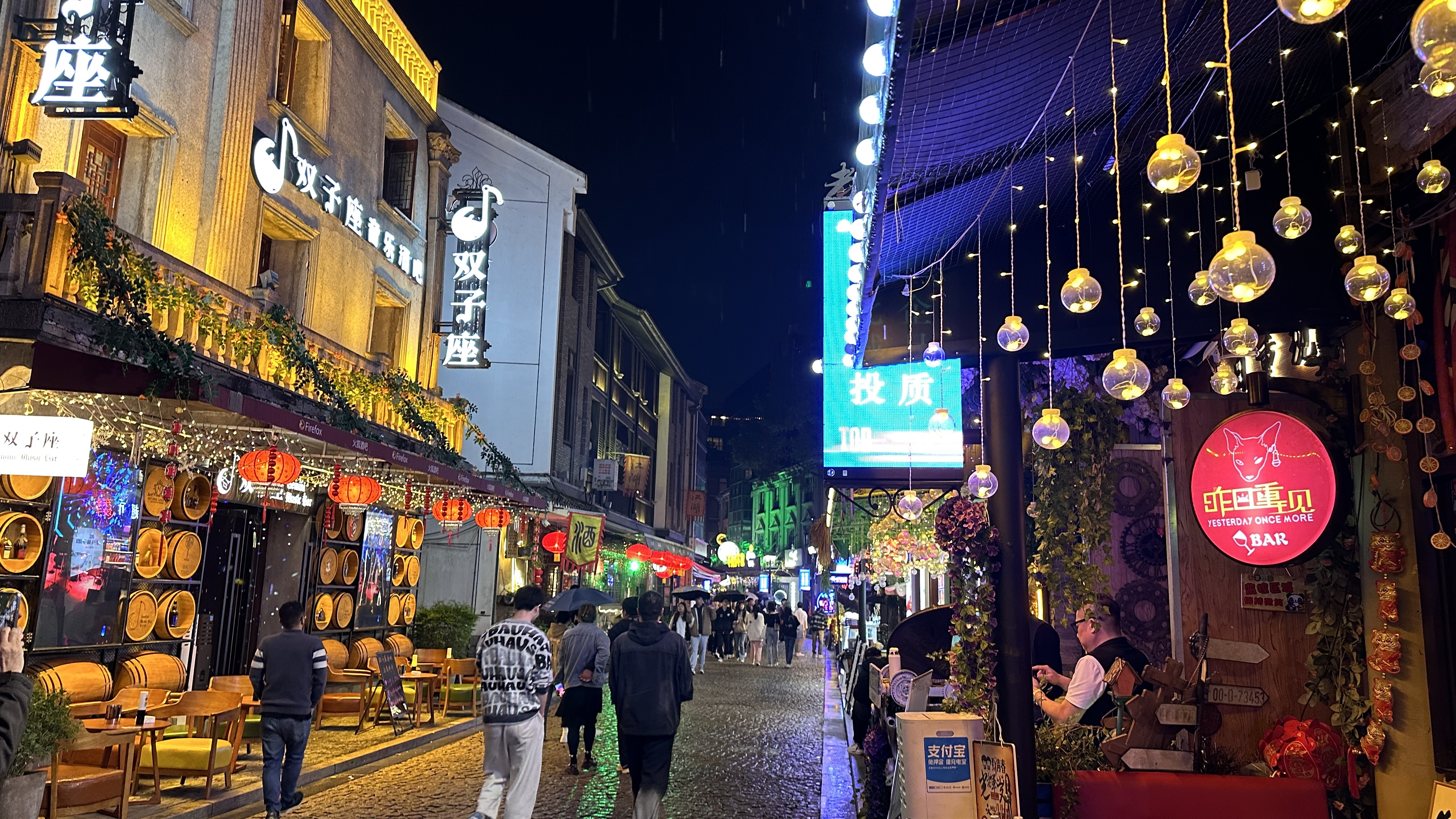 今晚微雨來到這裡,沿江邊裝飾起高彩炫麗的燈光,戶外咖啡雅座,搭配街頭藝人的煙嗓的歌聲,浪漫而文青﹔老外灘碼頭對岸的大樓,閃爍動感的燈光秀,迷人的夜生活才正要開始,走入酒吧一條街,許多老字號私宅洋房搖身一變,極富異國情調,小酒吧酒酣耳熱後,熾熱的浪舞與嗨歌的舞曲,狂歡一夜的紙醉金迷。
