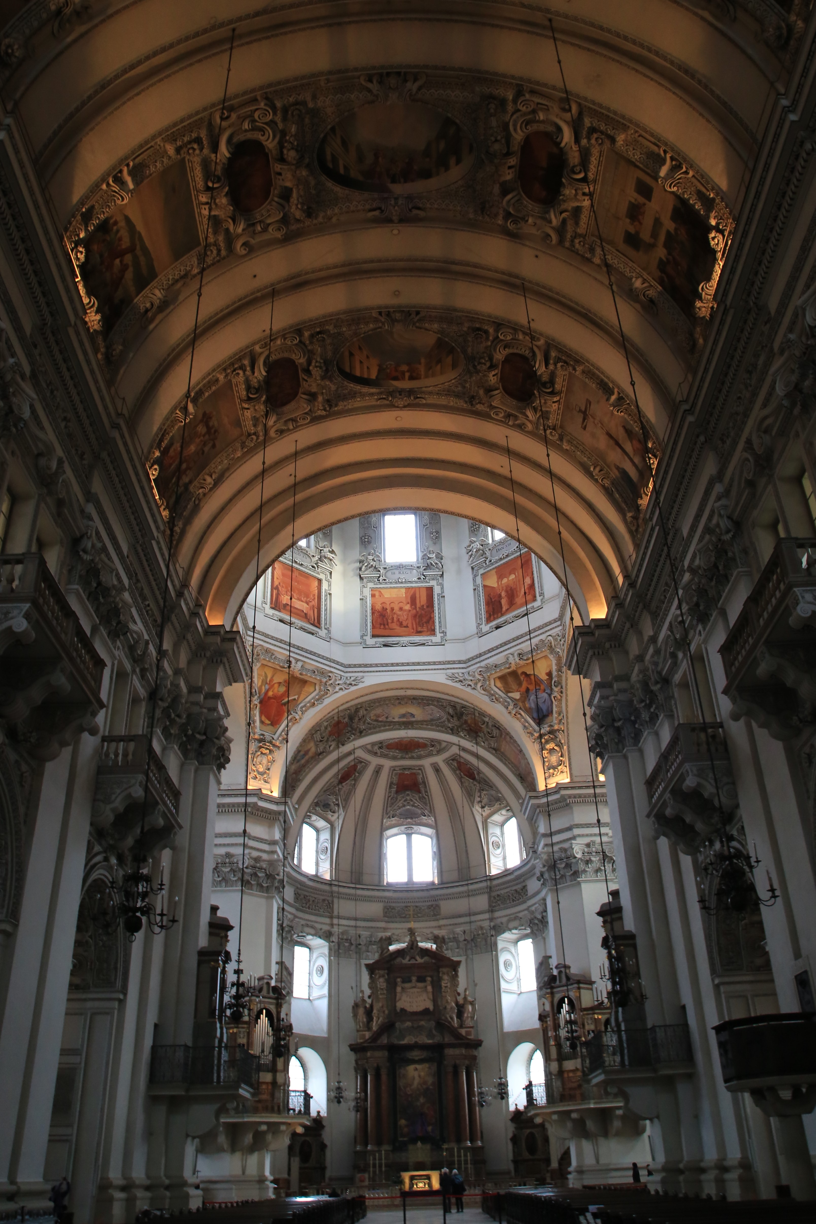 ▶山頂上的城堡/眺望薩爾斯堡遠方的天際線一覽無遺/大教堂內彩繪壁畫與廊柱的雕飾