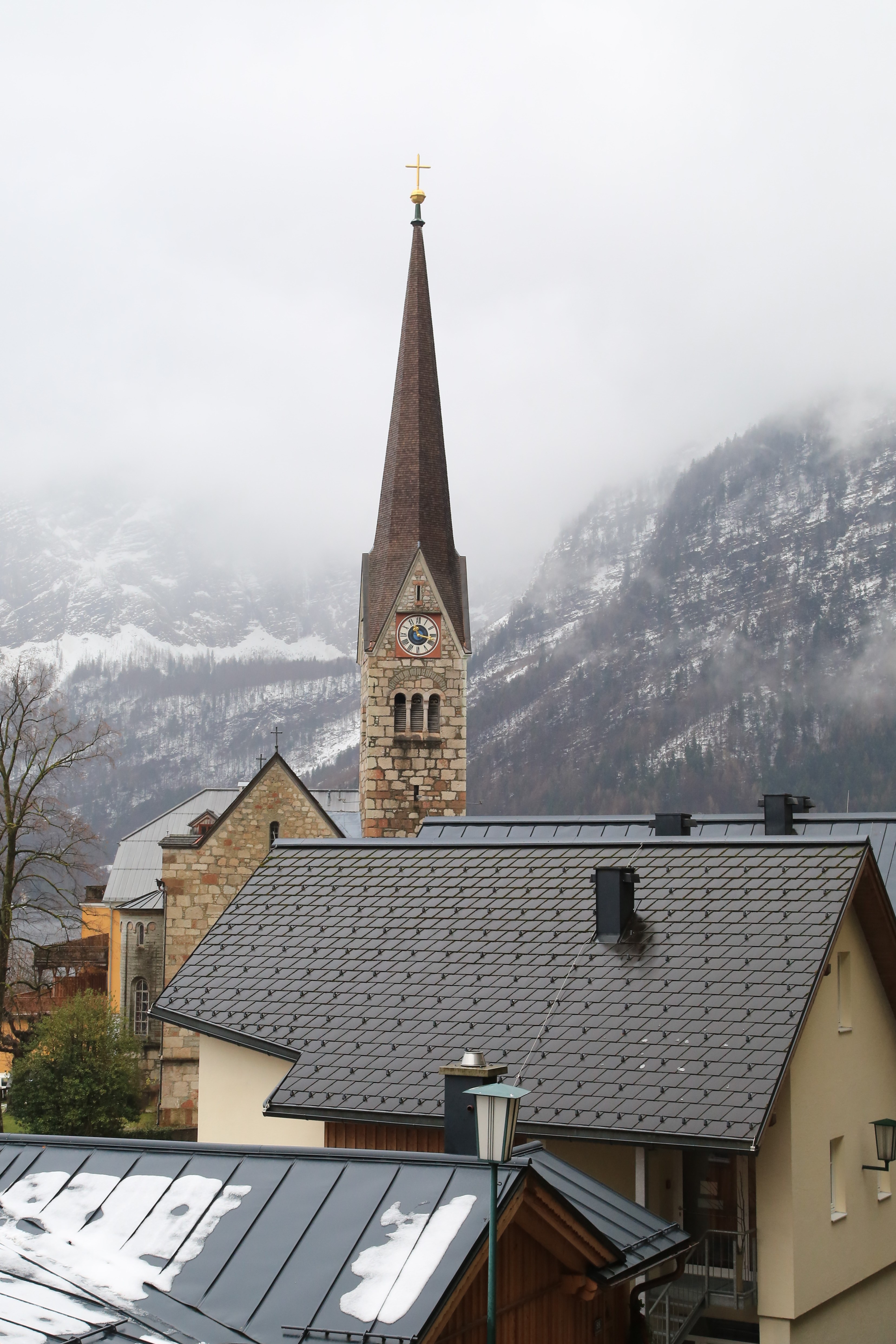 ▲最美的風景明信片-哈爾斯塔特小鎮/小鎮的教堂/湖光水漾