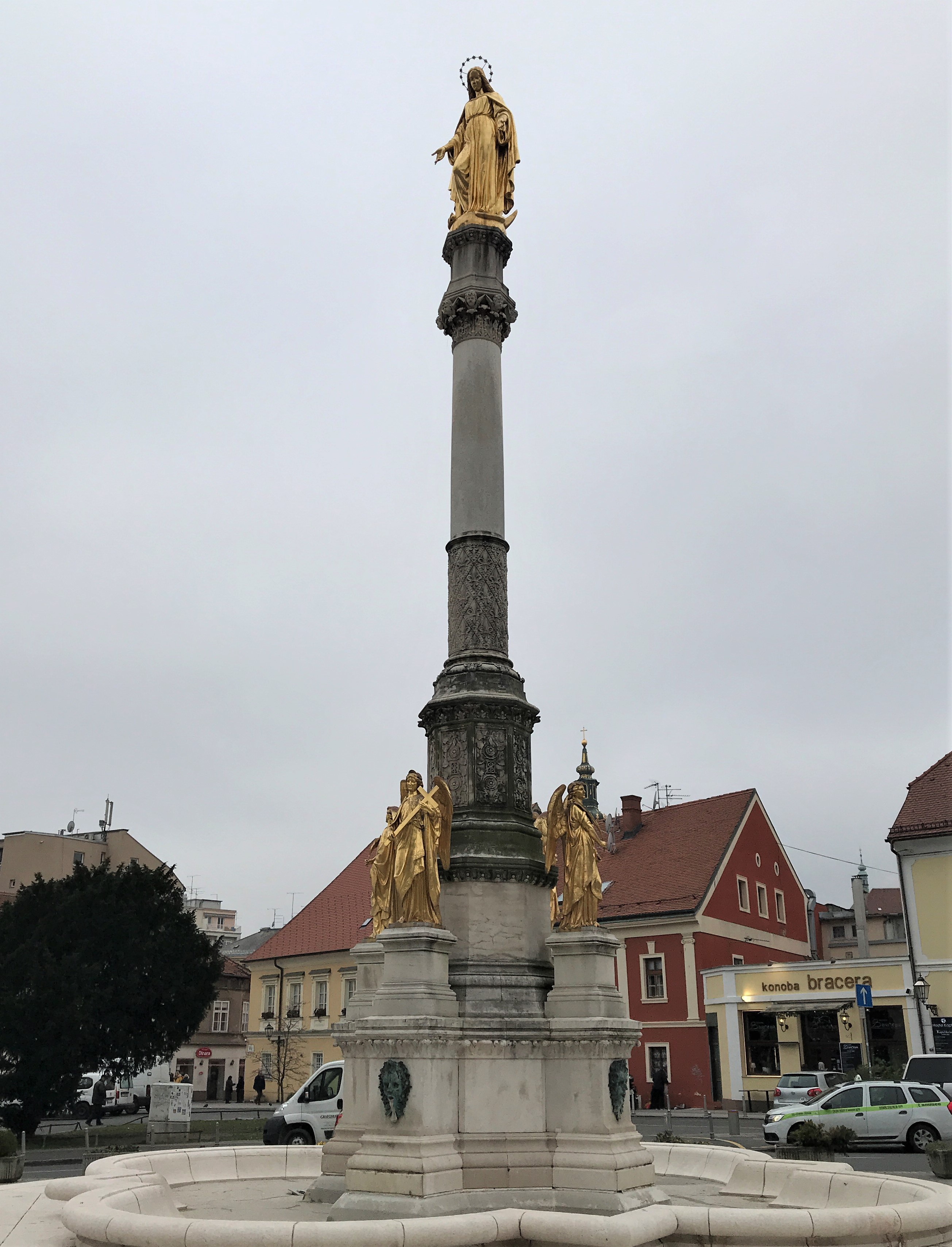教堂廣場外高聳的石柱,立著金色的聖母瑪麗亞與四尊天使雕像,四位天使分別代表基督徒的信德、望德、潔淨無罪以及謙卑的象徵。