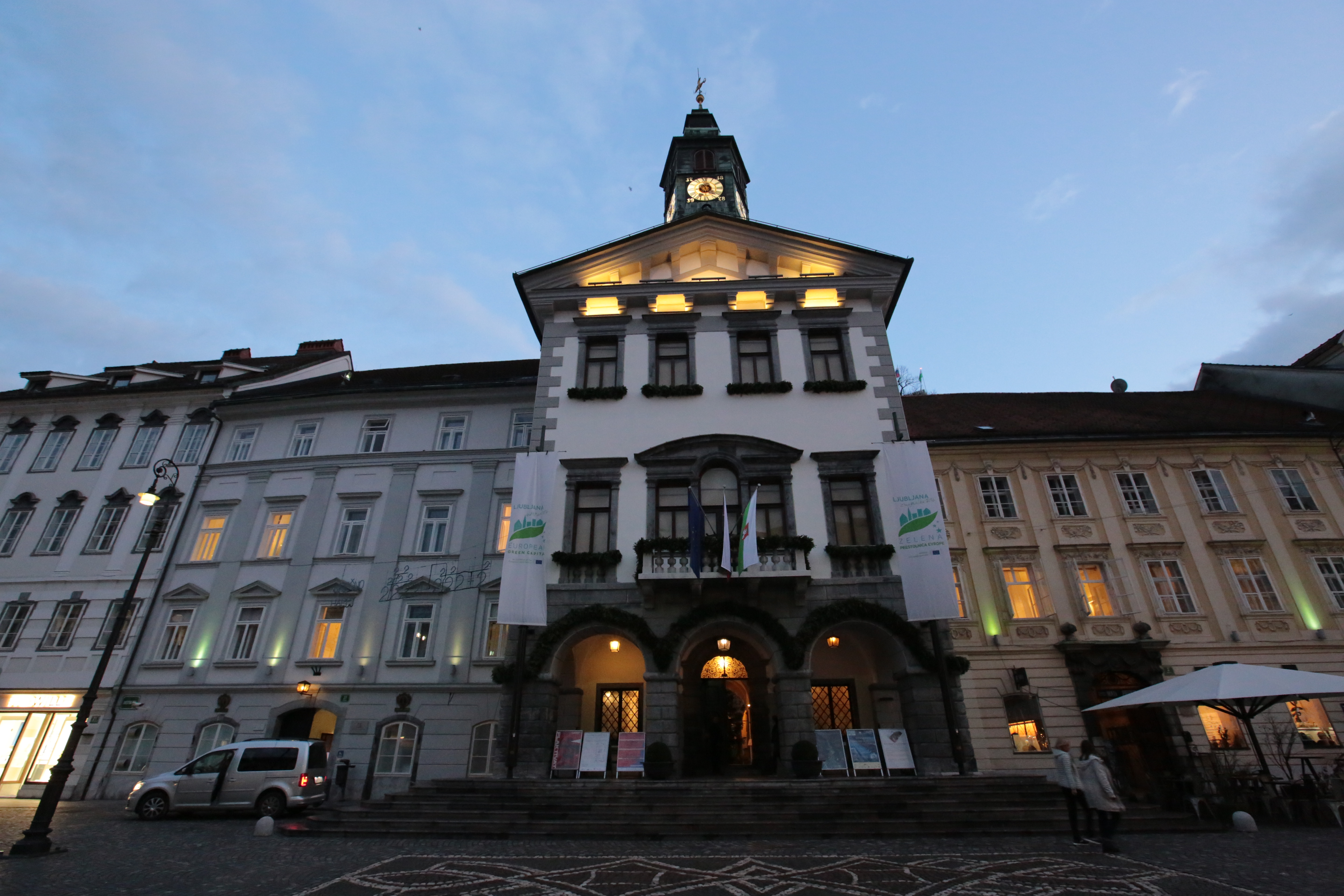 左側是郝普特曼之屋(Hauptman House)屬分離主義建築,1895年市區發生大地震,而郝普特曼之屋是少數倖存著,地震後外觀重新裝飾,具有維也納的新藝術風格,小陽台保留巴洛克風格。