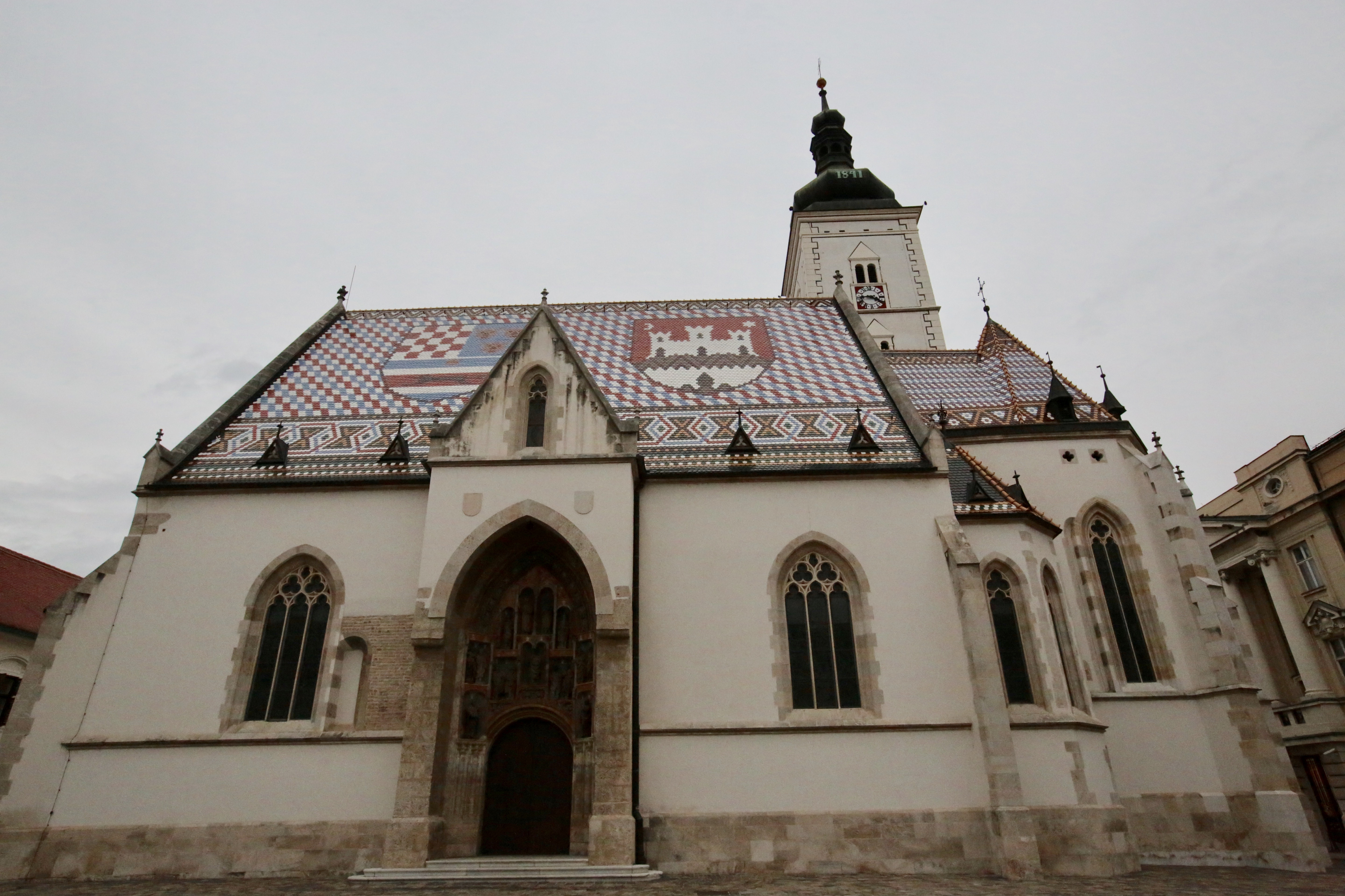 穿過石門後,一條復古的商店街頗具巴洛克風,而克羅埃西亞知名領帶店Kravata隱身其間,導遊說起領帶,起源於十七世紀克羅埃西亞士兵,而帶動世界風潮。不久抵達聖馬可教堂廣場,這裡是政教中心,右邊新古典建築的國會大廈,左邊總統府,中間是座美輪美奐的聖馬可教堂,遠遠望去教堂的屋頂最為吸睛,屋頂的瓦片鋪設成盾徽形狀的馬賽克拼貼,相當醒目;右邊圖案代表札格雷布市徽,底色是紅、白、藍三色;左邊圖案代表克羅埃西亞,則是歷史上三亞一體的王國,由克羅埃西亞、斯拉沃尼亞、達爾馬提亞組成,充滿著民族色彩。