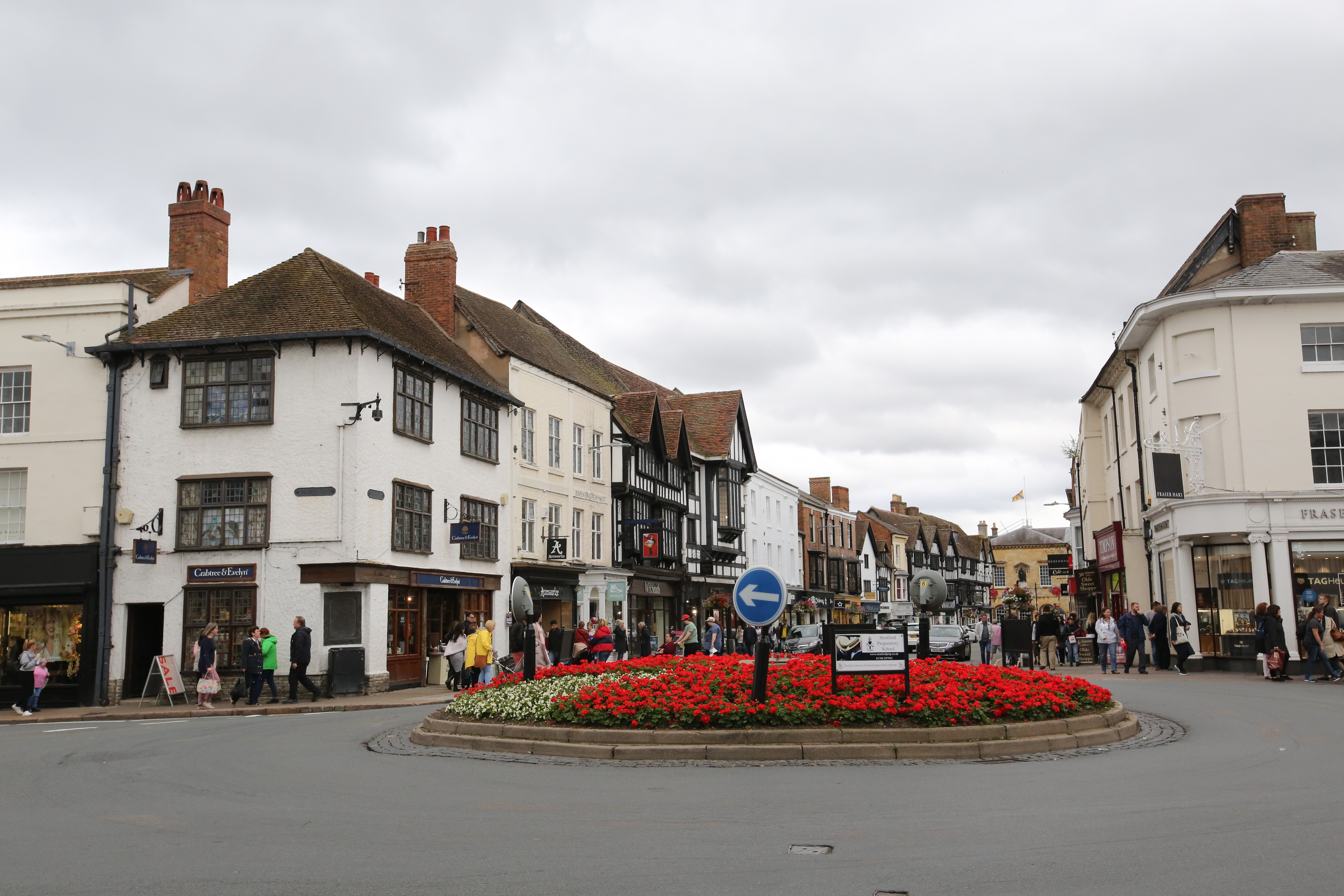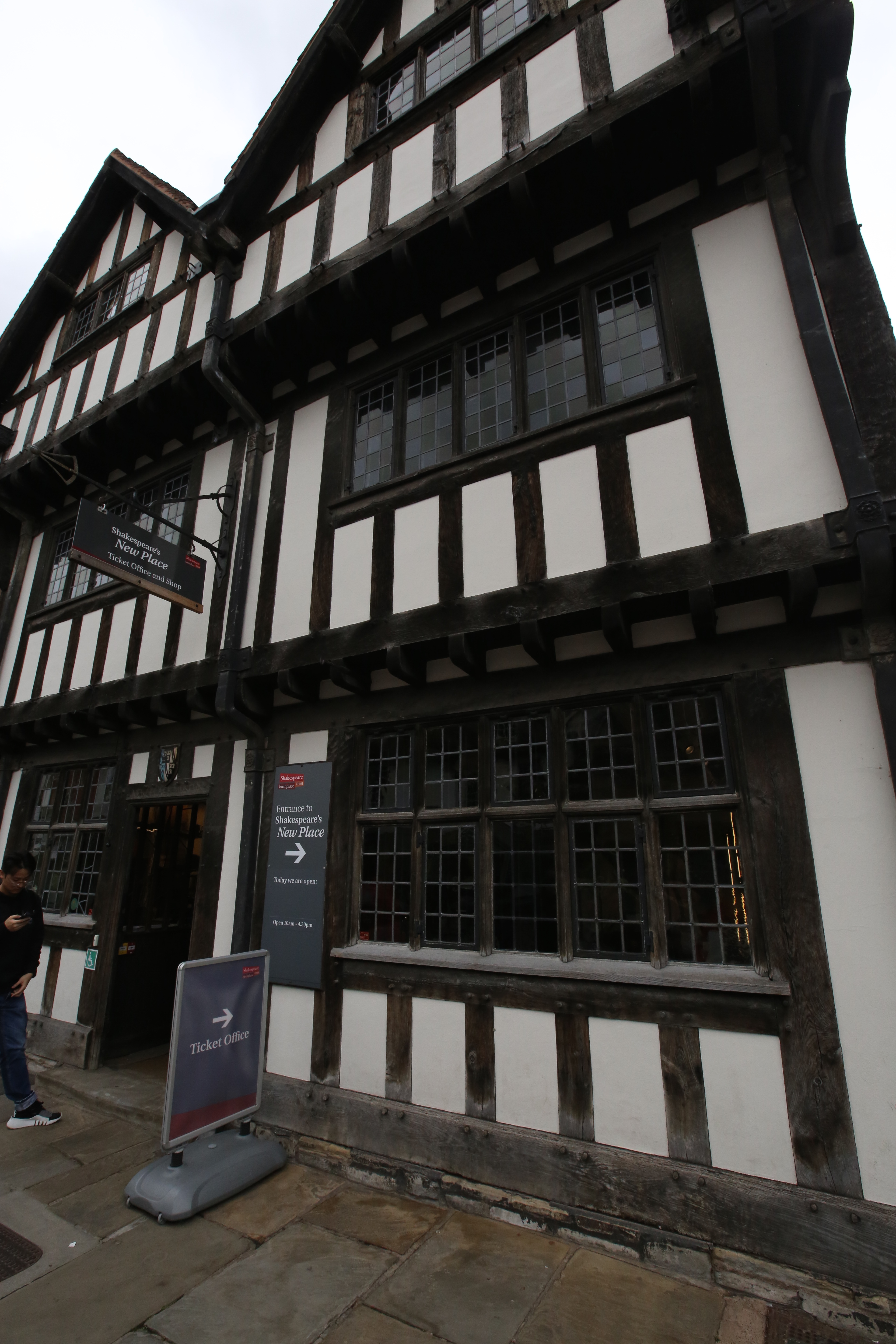 來到這個充滿文學氣息的小鎮,許多遊客抱著「朝聖」的心態,或許來之前多少聽過莎翁情史的故事,或研讀過茱麗葉與羅密歐、哈姆雷特….等曠世劇作,莫不被他悲劇所吸引,這裡不只是莎士比亞(1564-1616年)的故鄉,更是莎迷的文學故鄉。因此舉凡跟莎翁有關係的地點皆成為熱門景點,今日遊點不能免俗,跟著人潮前進就對了。不過,更吸引我的目光,卻是保存完整的都鐸式建築,一步一窺黑白相間的建築:三角型的木構造斜屋頂、凸出的老虎窗、取暖排煙的煙囪、木構的屋身、裝飾性的線腳等美學元素,極具都鐸時代的特色。