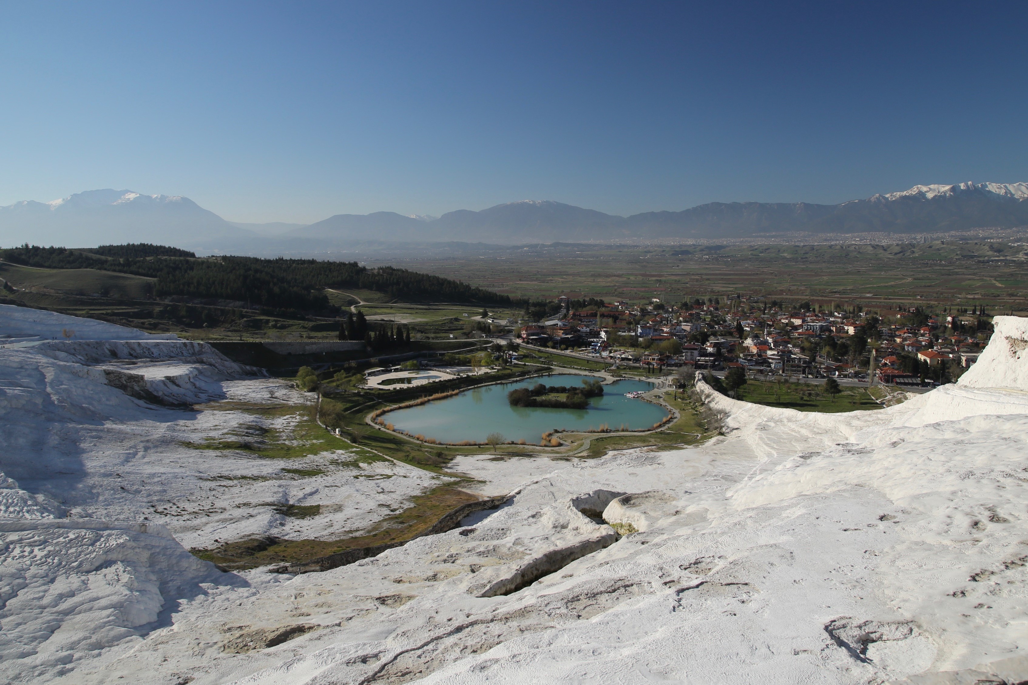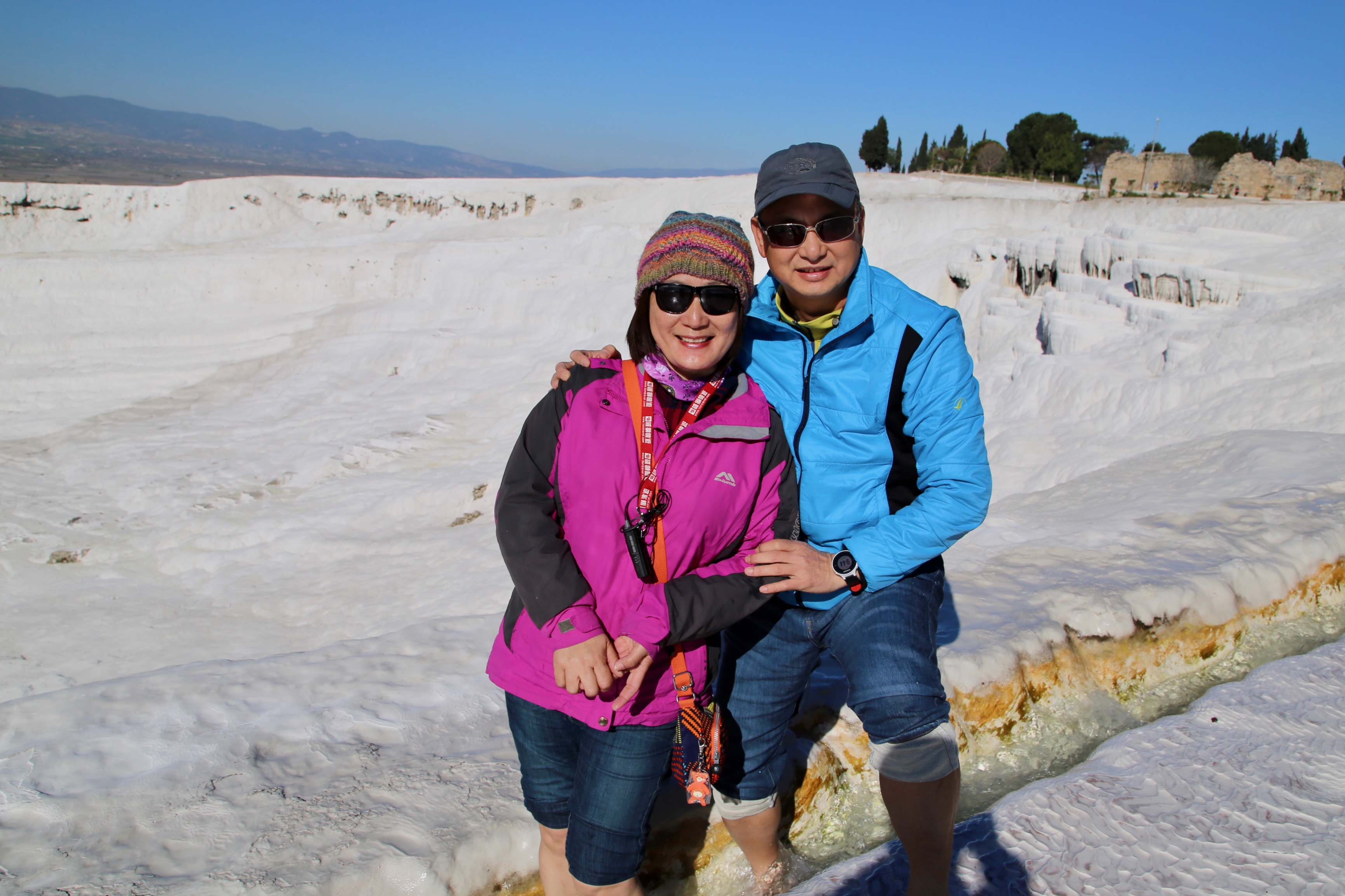 離開愛琴海濱向西行,一路眺望遠山的雪峰,接近終昏時刻,視界裡突然迸出一座白色山丘,好似鹽山一般潔白,導遊說這裡就是巴穆嘉麗Pamukkale溫泉古鎮,地名的意思就是棉花城堡,我想每個地方對自己所居住的鄉土,都有一種莫名的情感投射,把地理特性圖像識覺化,無異是一種文化想像的表徵,自古皆然;卸下一身塵勞,而今晚入宿溫泉飯店,迫不及待泡澡去,明日一早還要參觀一處世界文化遺址-希拉波里斯古城Hierapolis。