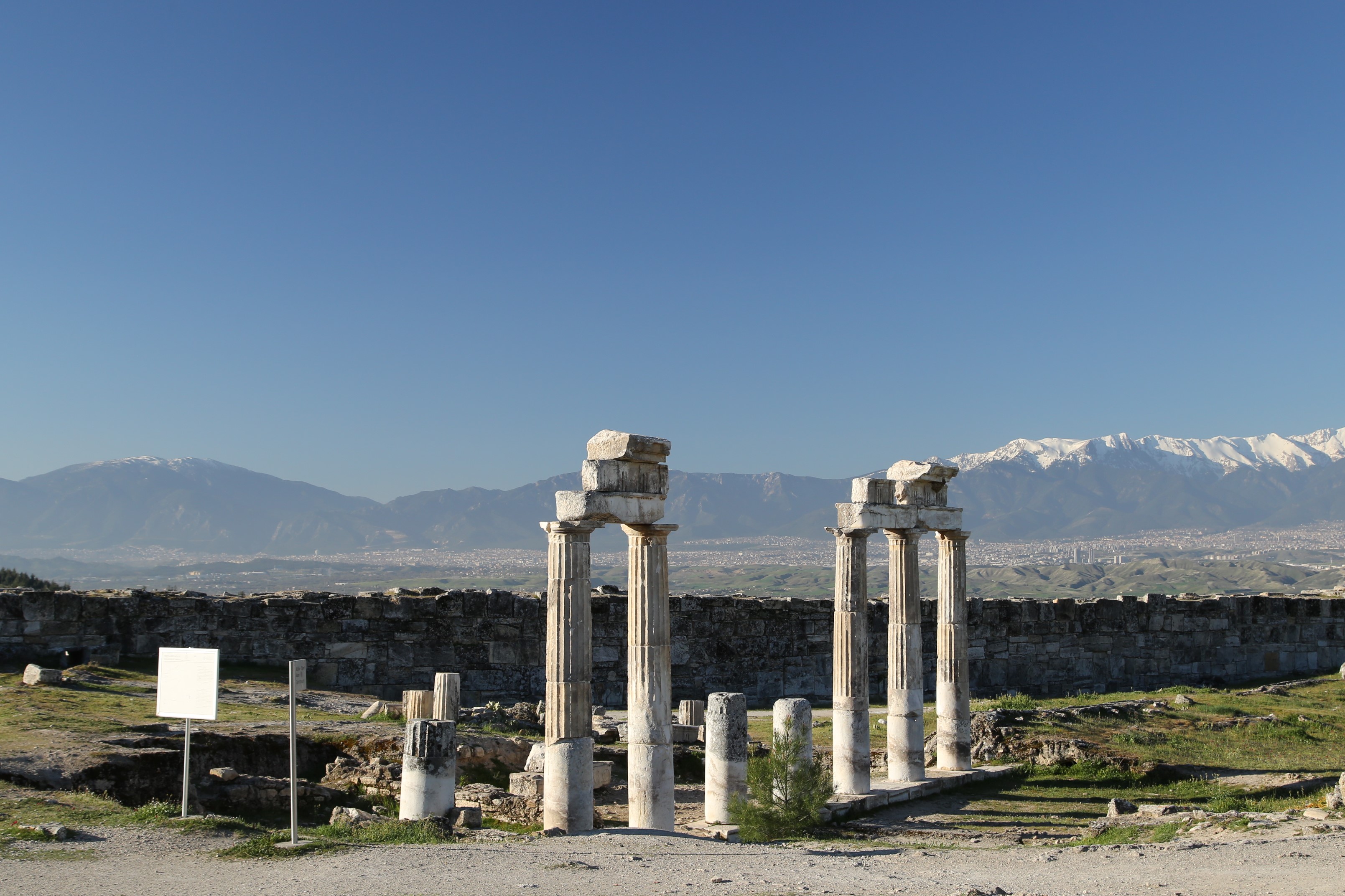 ▲希臘式列柱與遠方雪峰相呼應/羅馬溫泉浴場,池裡散落希臘羅馬式的柱石/後山散落一片神殿、劇場、古城牆等殘跡