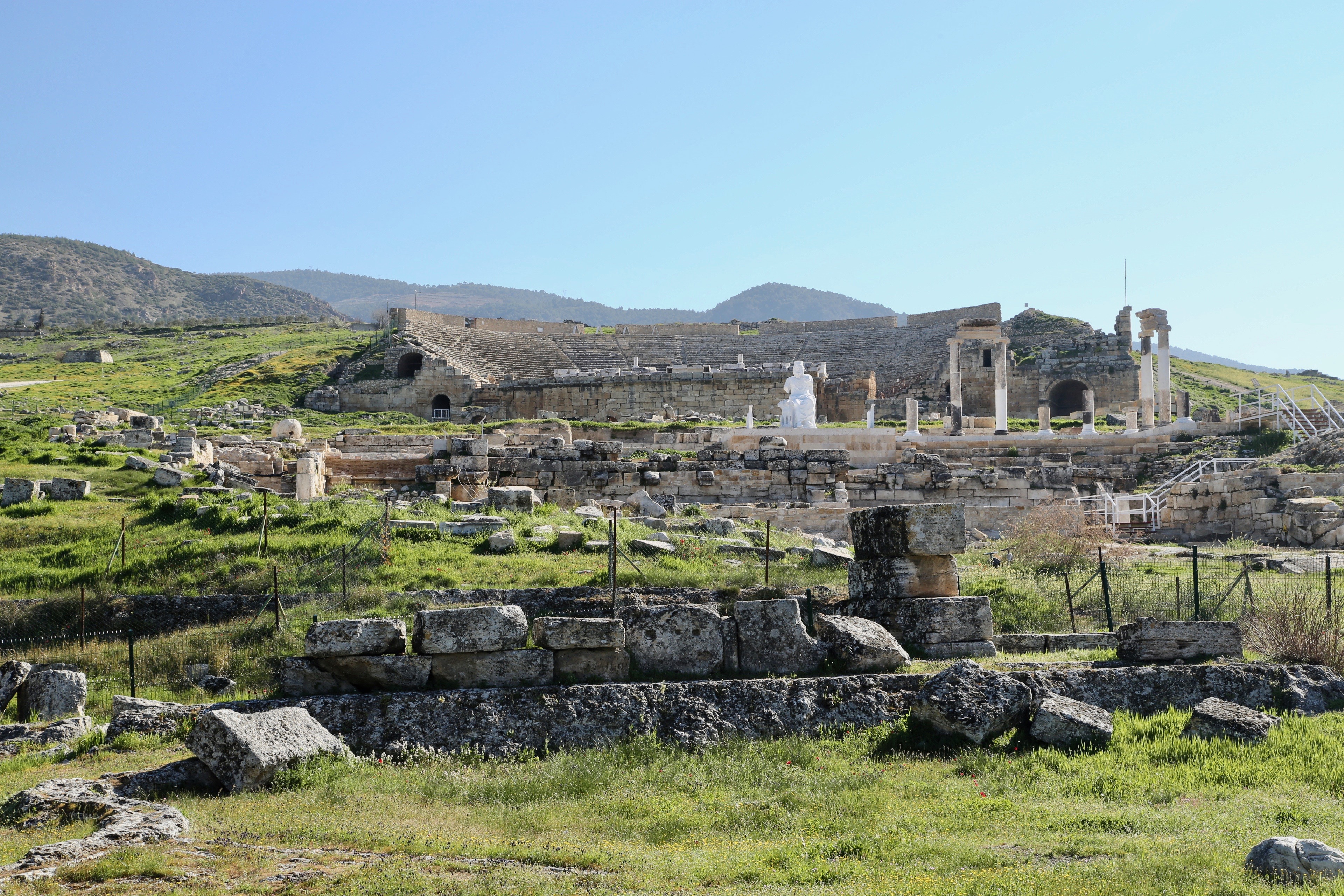 沿園區路徑指標前進,雖是遺跡殘址,依稀可見當年希臘、羅馬、以及早期基督教等建築風格與盛況。從博物館大道通往羅馬溫泉浴場,今成為觀光客最愛的大泳池,池裡散落希臘羅馬式的柱石,與古蹟伴游別有一番感受,鄰近後山散落一大片神殿、劇場、古城牆等殘跡,因時間關係只好站在古羅馬浴場眺望。且把多餘遊興放在壯觀的石灰棚。