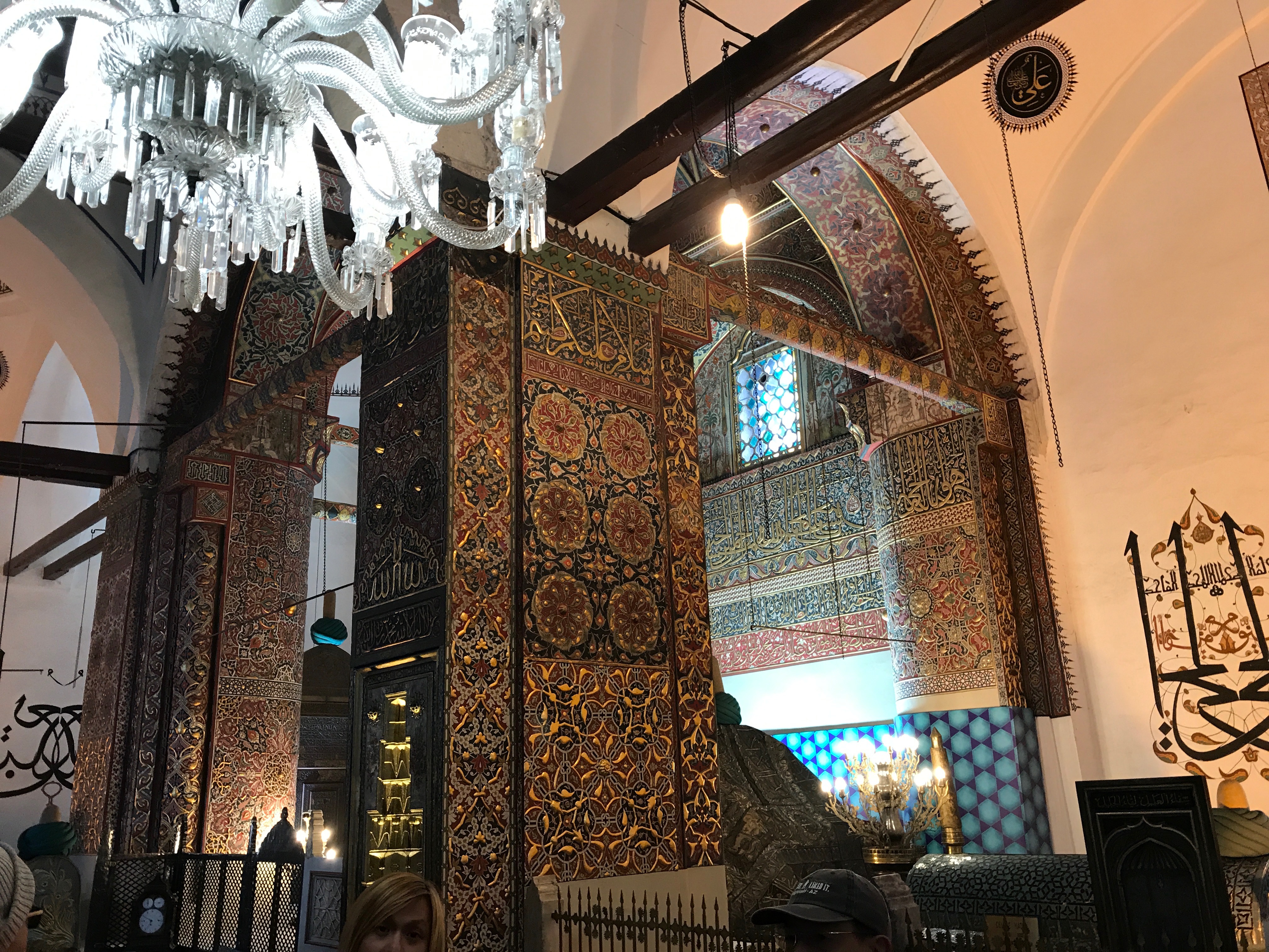 套上鞋套懷著莊嚴肅穆的心情,進入博物館中央,即見聖人的石棺,棺上安放一只纏著偌大的頭巾,象徵著無上的精神權威,館內華麗的紋飾佈滿流動的空間,許多信徒向著聖靈區靜禱,一股虔誠力量牽引至迴旋教派的原始感動!仿彿見到一位迴旋舞者裝扮,戴著高帽子(象徵墓碑),穿著黑衣(象徵死亡),自軸不斷的迴旋,直到忘我狀態,精神即進入與神溝通層次,此刻再慢慢脫去黑衫露出白色的底袍,象徵受神啟示而達到重生的地步!