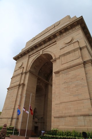 出了紀念館,附近就是印度國會區,車繞行噴水池兩圈,眺望國會大廈後前往印度門,外觀與巴黎凱旋門很相似,是為了紀念第一次世界大戰犧牲的9萬名軍人而建,牆壁上刻著陣亡將士名錄,是德里重要的英雄地標,四周打造成為ㄧ座城市公園,附屬綠地、水池、鐘樓的景觀,也是德里市民日常休憩的地方。