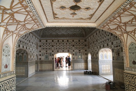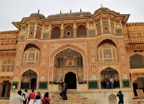 乘騎大象搖搖晃晃上山,穿過太陽門進入這座城堡,這是辛格一世 (Raja Man Singh I) 於1592 年時開始興建,融合印度教和蒙兀兒的建築風格,尤其是鑲崁的裝飾工藝,令人讚嘆不已!