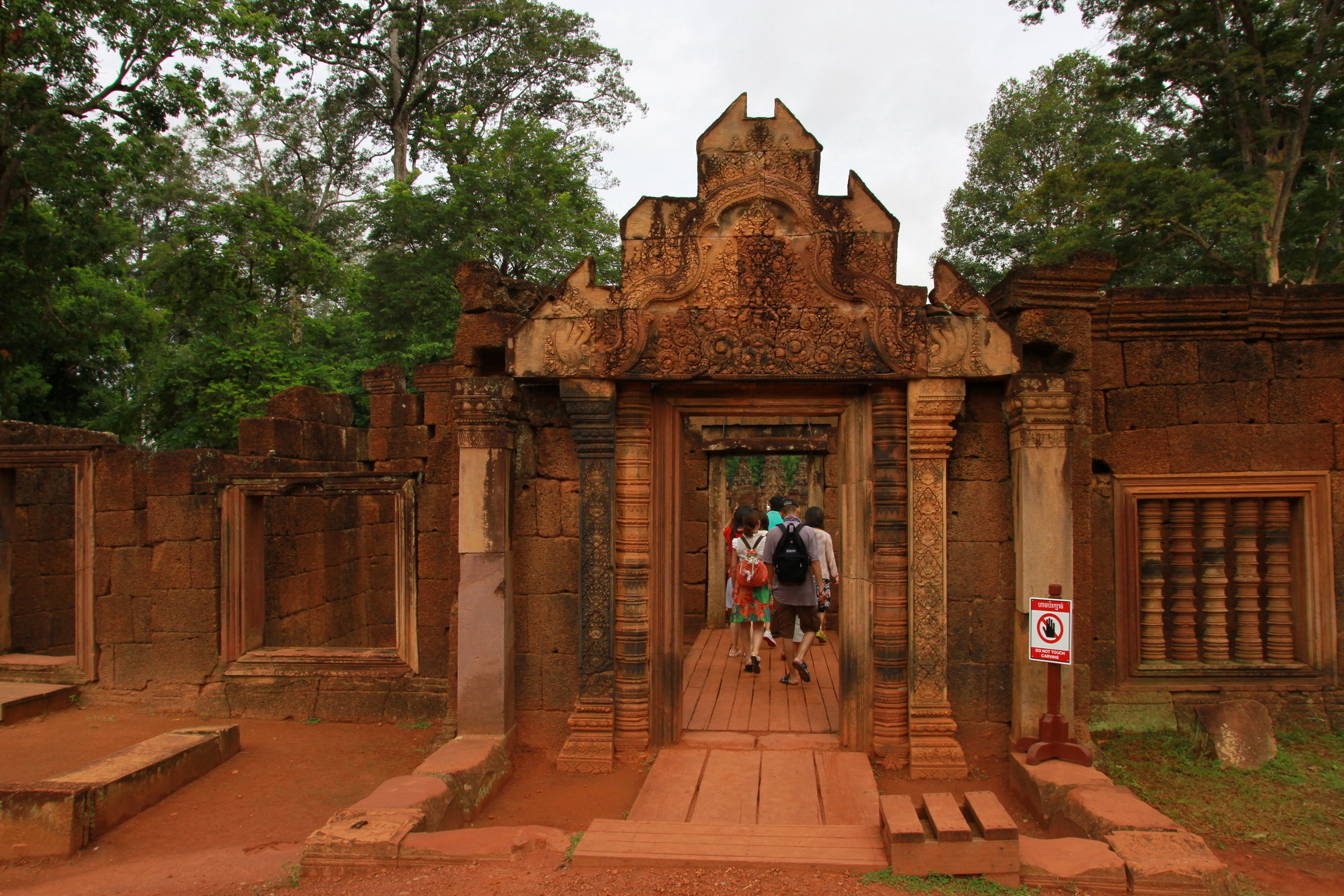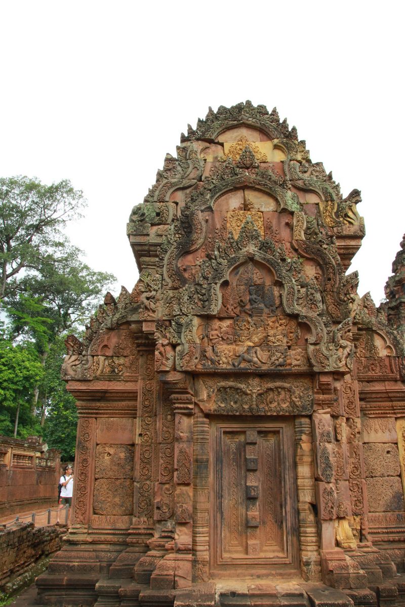 是闍耶跋摩五世〈JayavarmanV〉在967年修建的古寺,又名為「女皇宮」,是供奉婆羅門教三大主神之一的濕婆神〈屬毀滅與創造之神,濕婆稱為「Mahadev」意思是毀滅者,同時是復生者〉。由於建造此座古剎時,特別精選粉紅色的細質砂岩,陽光照射下帶著淺淺的粉紅色澤,如夢幻般情境,引導進入眾神世界。這裡的雕刻精美細緻,匠師竟能在石塊雕刻琢磨出層次分明,線條纖柔一氣呵成的作品,令人讚嘆!我認為最有看頭是在門楣上山形牆,邊緣極盡能事裝飾雕花,中央圖象極盡奢華鏤著印度教神話故事,由上而下端詳主題似乎透露出創世紀時渾沌初開,濕婆神居高端坐在五重山,天界惡魔拉法那,幻化出無數頭顱和手臂,大地震動走獸和神鳥走避,開啟諸神世界之門,巨蛇攪動渾沌的乳海,因陀羅神手持金剛杵,坐騎在三頭神象上,浪花翻騰如花瓣向內旋轉,地面上還雕著濕婆神座騎-聖牛,不過被人盜砍掉只剩半隻,整個繪本妙不可言。是柬埔寨藝術的顛峰傑作,有「吳哥藝術之鑽」的美譽。走進班蒂斯蕾古寺就好似閱讀一部古老印度史詩,壯闊的嘆為觀止,心嚮往之,久久不捨走出藝術寶庫。
