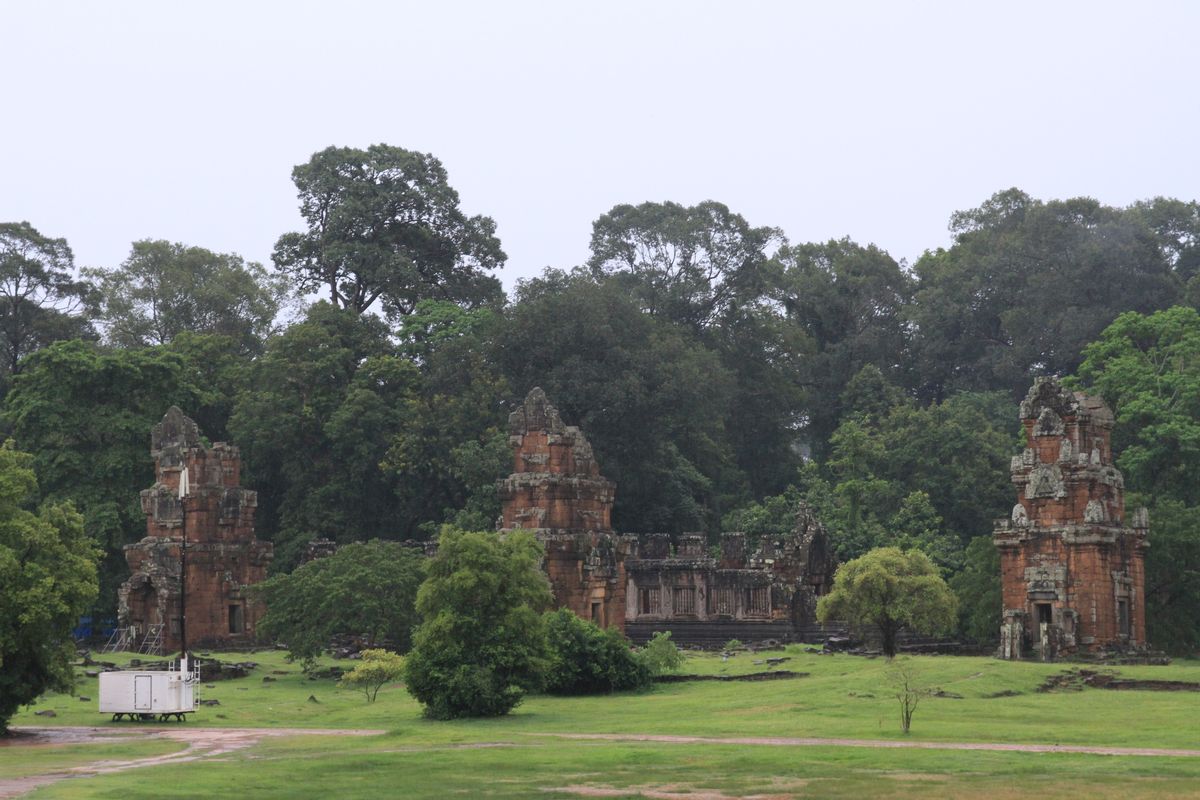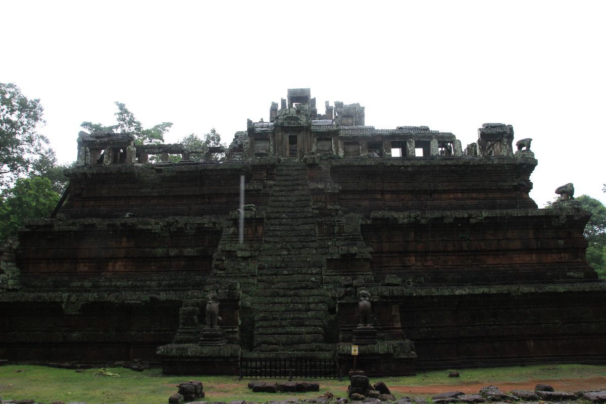通過彩虹橋就到Baphuon,因為正在大規模整修,我們只好在外圍觀賞。此遺址是烏岱亞迪亞跋摩二世〈UdayadityavarmanII〉所建的國寺,於11世紀初完工,是當時高棉境內面積最大,高度最高的神廟。周達觀在「真臘風土記」記載,「比金塔更高,望之鬱然」,這座國寺格局,依然受印度教山形神殿風格影響。倒是神殿的西側有一尊未完成的臥佛,可證實這時期吳哥文化逐漸由印度教跨入佛教,而留下這尊臥佛,可惜煙雨濛濛看不清臥佛巨像。