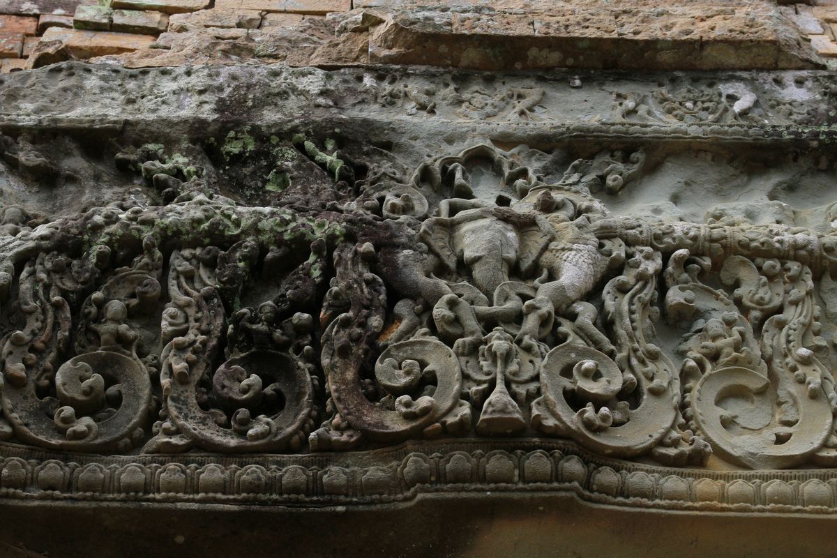 這是堅德拉跋摩所建的國寺,在神王一體的信仰下,其死後肉體必須火化後,才能回到須彌山,與毗濕奴神合一。於是這裡就成為古代王族火化變身為神的神殿,兼具火葬場的功能,進入國王停屍間、火葬塔、用椰子水洗骨的地方,據說洗骨後的椰子水,後世子孫必爭先取用,可以得到庇蔭,走過國王生命終所,或許聽了種種傳說,有種陰森的感覺。仰望這裡建築與一般國寺無異,皆有須彌山的意象,層層石階向上構築,最上層平台有五座塔,中央塔寺就是須彌山。這裡雕刻十分有特色,在紅磚上覆蓋一層灰泥,渾厚的神像和人體,極為寫實。門楣上可以看到石雕,技法更為精美,因陀羅神坐騎在三頭神象上,兩條巨蛇攪動乳海,浪花翻騰旋轉如花瓣,這種雕法與班蒂斯蕾古寺雕工如出一轍。