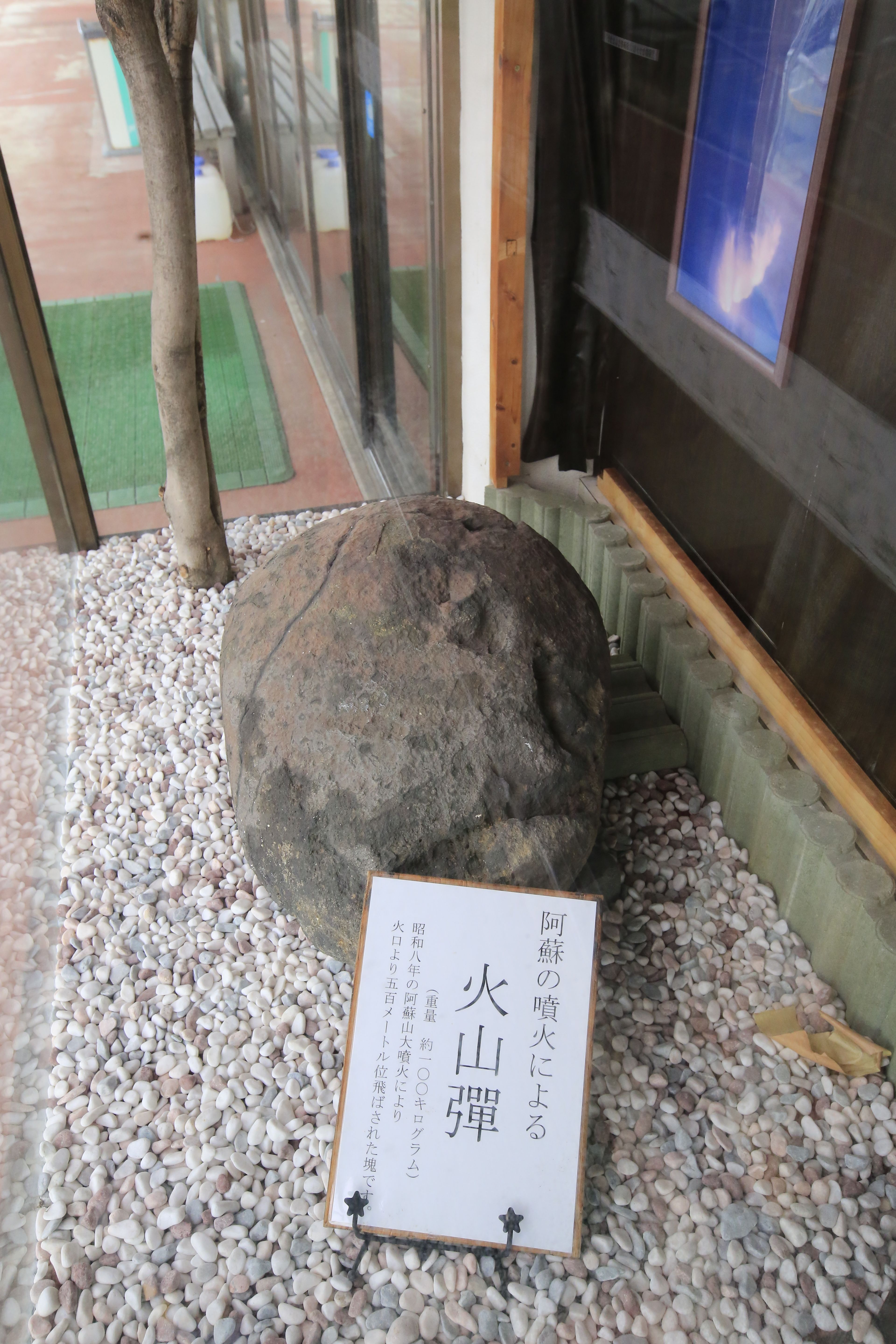 今天(6日)天氣陰有細雨,前往日本第一大複式火山-阿蘇山,阿蘇火山在 5 萬年前結束噴發,火山熔岩覆蓋整個山區,原本有纜車可以接近到火山口,不知何故纜車受到災害而毀壞,只能在阿蘇山神社眺望火山口,不斷冒出一團團白煙。而纜車站內二樓設有3D環形劇場,可以購票入內,欣賞到整個阿蘇火山四季景色的投影,以及火山地形的構成。中午回到⇝【阿蘇草千里】景區,位於阿蘇北麓山腰上的草千里,與自然形成的湖泊,是當地居民放牧的好牧場,天氣好的時候,可以看到牛馬在草場上悠哉自得,冬季這裡則變成滑雪場。可惜我們來的不是時候,兩者都看不到,只見一大片荒原曠野,以及店家在門口展示的火山彈,似乎有意告訴我們這裡曾經天翻地覆過!