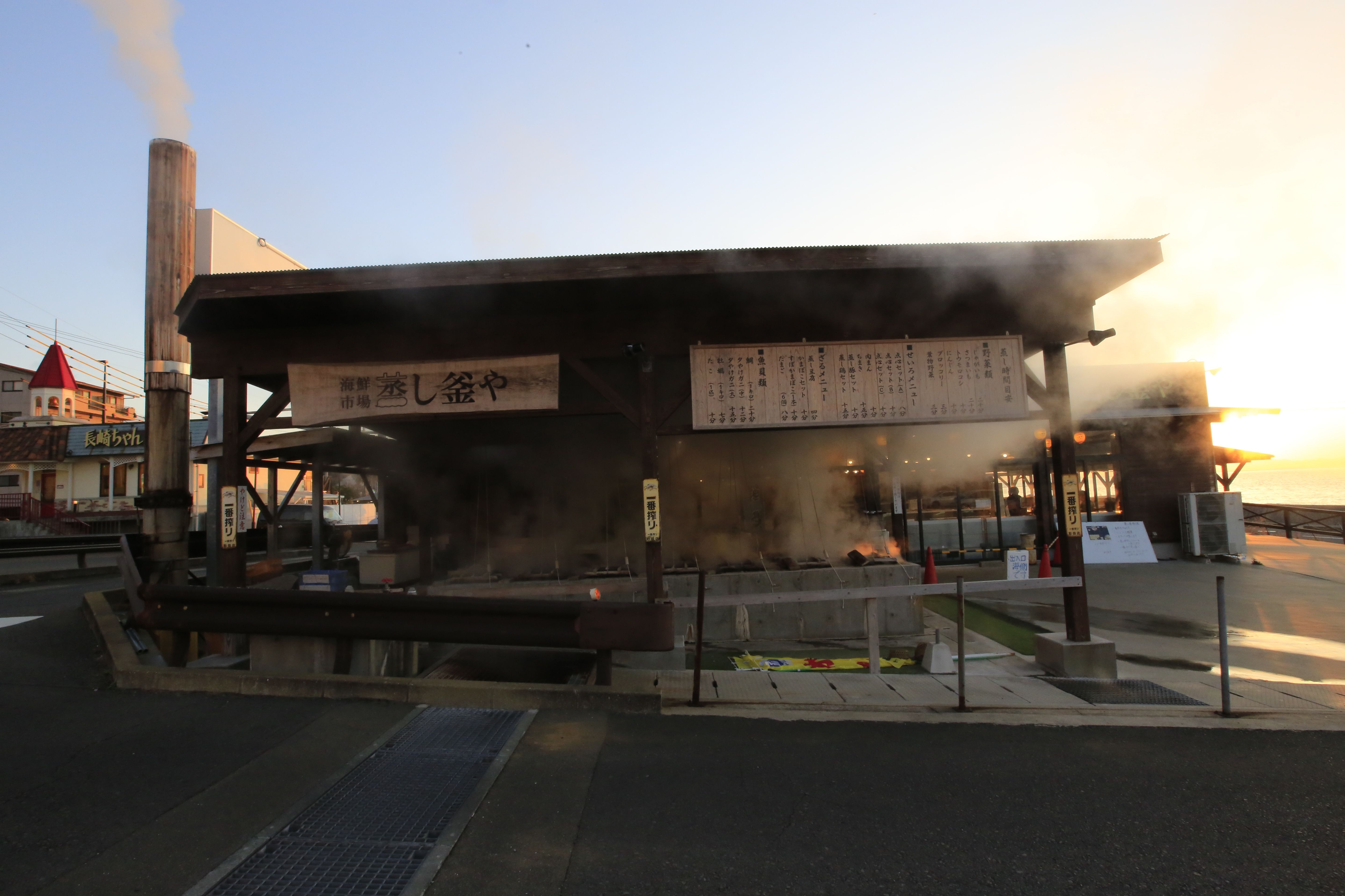 小濱溫泉是日本熱量最足、水溫最熱的溫泉。今晚我們就在鎮內溫泉旅館住下來,街道到處看見氤氳的白煙,別小覷這沸騰的泉水(105℃),據說對神經痛、神経痛、風濕、慢性婦女病等具有療效。因此,我們放下行李後,趁飯前空檔,迫不及待就步行到對街面海的⇝【足湯】,這一座足湯據說是日本最長、最熱的一條,約105公尺長,可先從湯泉較遠段試溫度,然後往前段前逐漸泡腳,泡腳之餘還能欣賞橘灣的晚霞美景,其樂陶陶足以忘憂!不遠路口有間蒸釜店,供給客人點選山珍海味的食材,如:蛋、蔬菜、海鮮等,利用溫泉蒸氣蒸熟,料理出一道道鮮美的野味。看似這樣簡單料理,就足以讓人食指大動,要不在下榻的溫泉旅館已訂好和食,還真想進店嚐鮮。