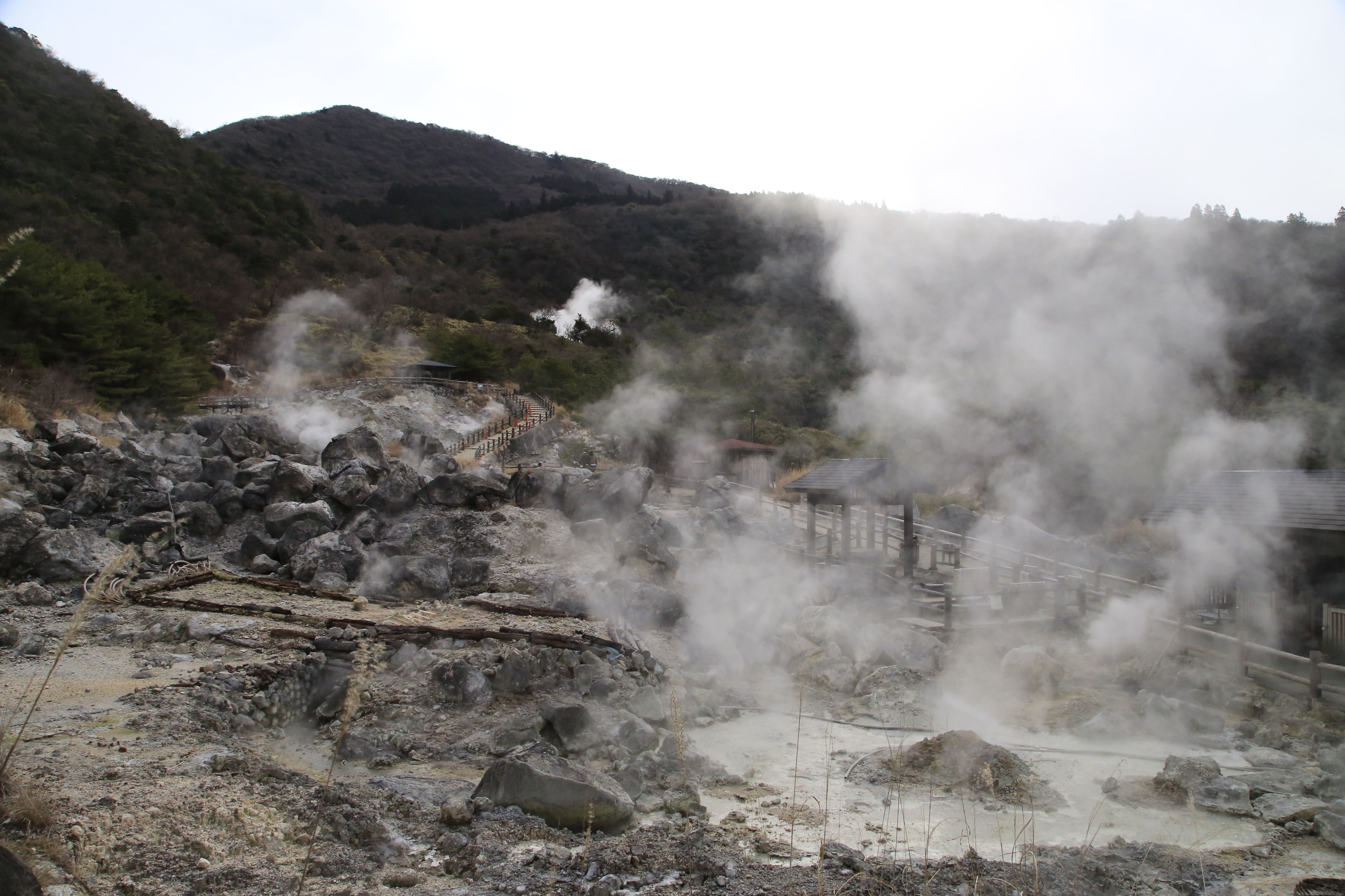 一夜舒眠,一早帶著愉悅的心情,前往位在島原半島的雲仙國立公園,其與瀨戶內海、霧島另外兩座,並列為日本最早的國立公園。抵達類似遊客中心的情報館,先取得導覽摺頁簡介,然後按圖索引遊⇝【雲仙地獄】,由於從眼泉不斷地冒出水蒸氣,園區內籠罩著一大片硫磺氣味,與濔漫白色氣霧蒸騰著,彷彿置身於地獄,聞其名就像北投的地獄谷。不過這裡的地獄,多以傳說而命名,如「御絲地獄」(名叫絲的婦女,因通姦殺夫被處死於此泉)、「大叫喚地獄」、「雀地獄」…等,以及幕府時期殉道的教士紀念碑,漫步於其間,彷彿可以感受到另一個神秘空間的存在。