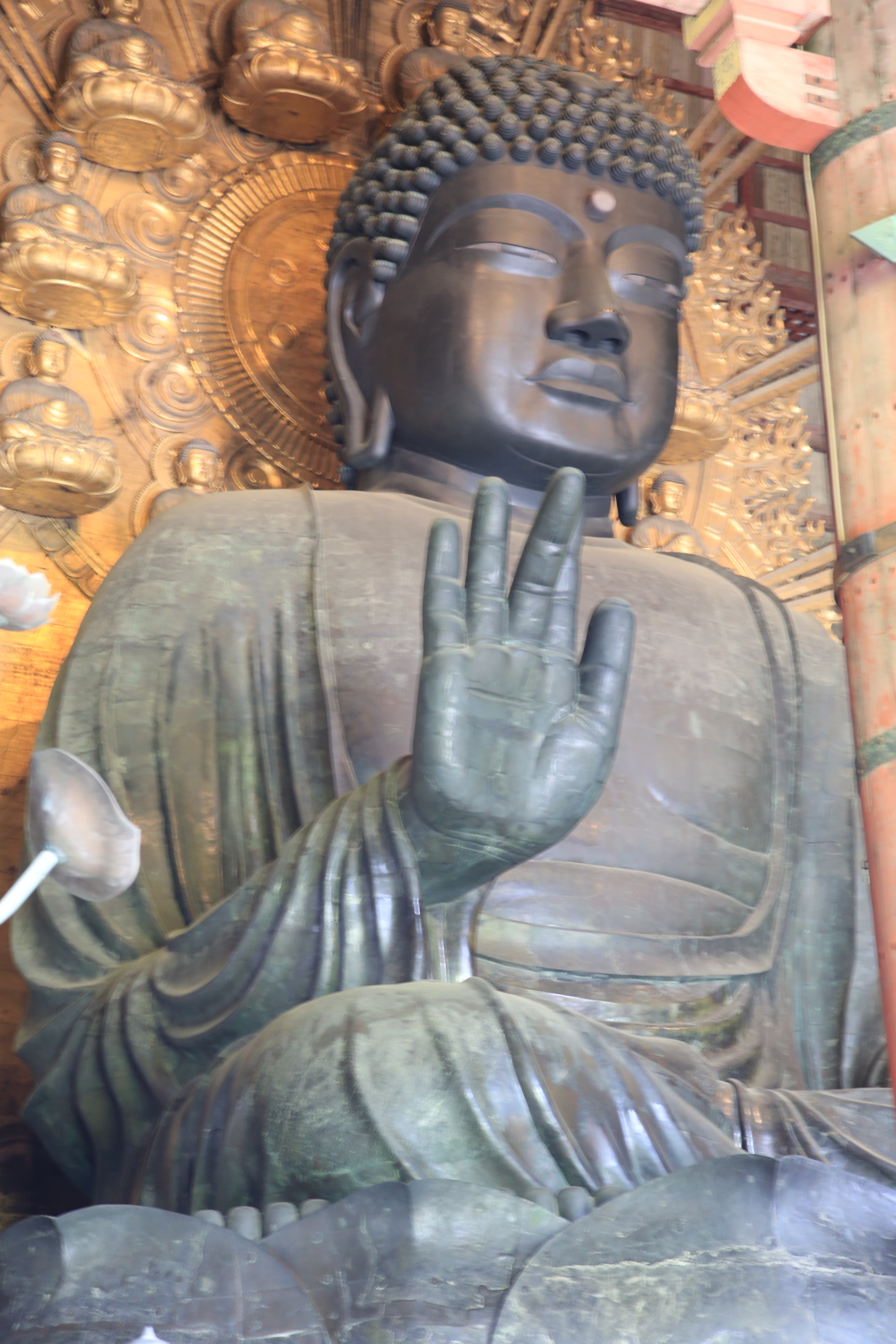 這日我們從南大門進入參拜,厚重的重簷歇山屋頂用18根巨柱支撐,氣勢非凡;二進中門兩側迴廊連接,沿廊道指示路徑循序禮佛;肅然為眼前木造大佛殿震懾到,中庭綠茵草坪,有助視覺的延伸,聚焦於大殿建築,重簷歇山的屋頂正脊有一對金色魚尾翹起,無論是工藝技術和規模夠大器。入大殿看到一樁有趣現象,大殿的柱洞有不少人排隊躦過去,據說能躦過去就能帶來好運,至於我就很識趣隨喜,旁觀一群幼兒接力快樂的躦過柱洞,出了寺院又見鹿群在寺廟四處趴趴走,這裡的鹿相當於佛教的象,已成為吉祥物。