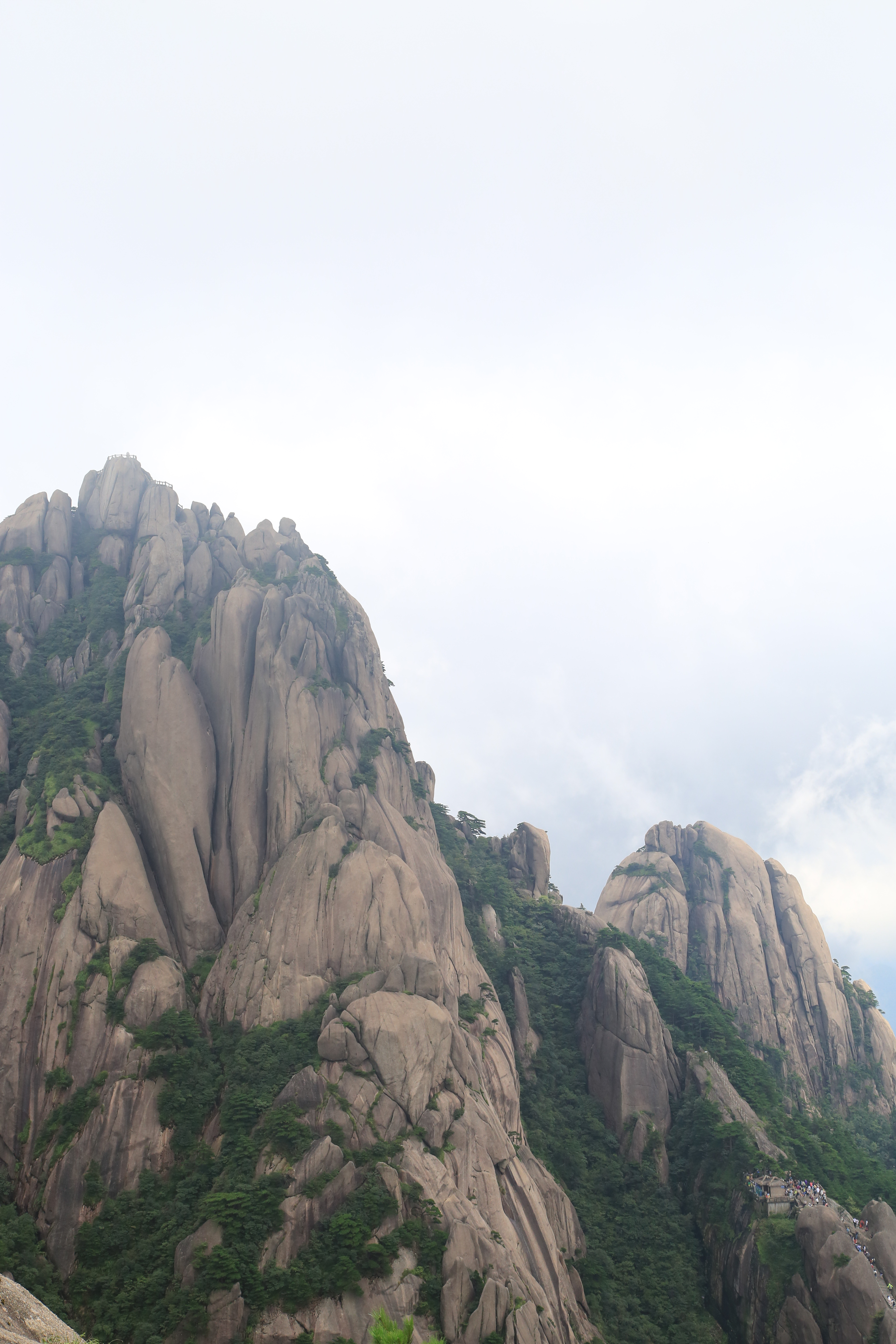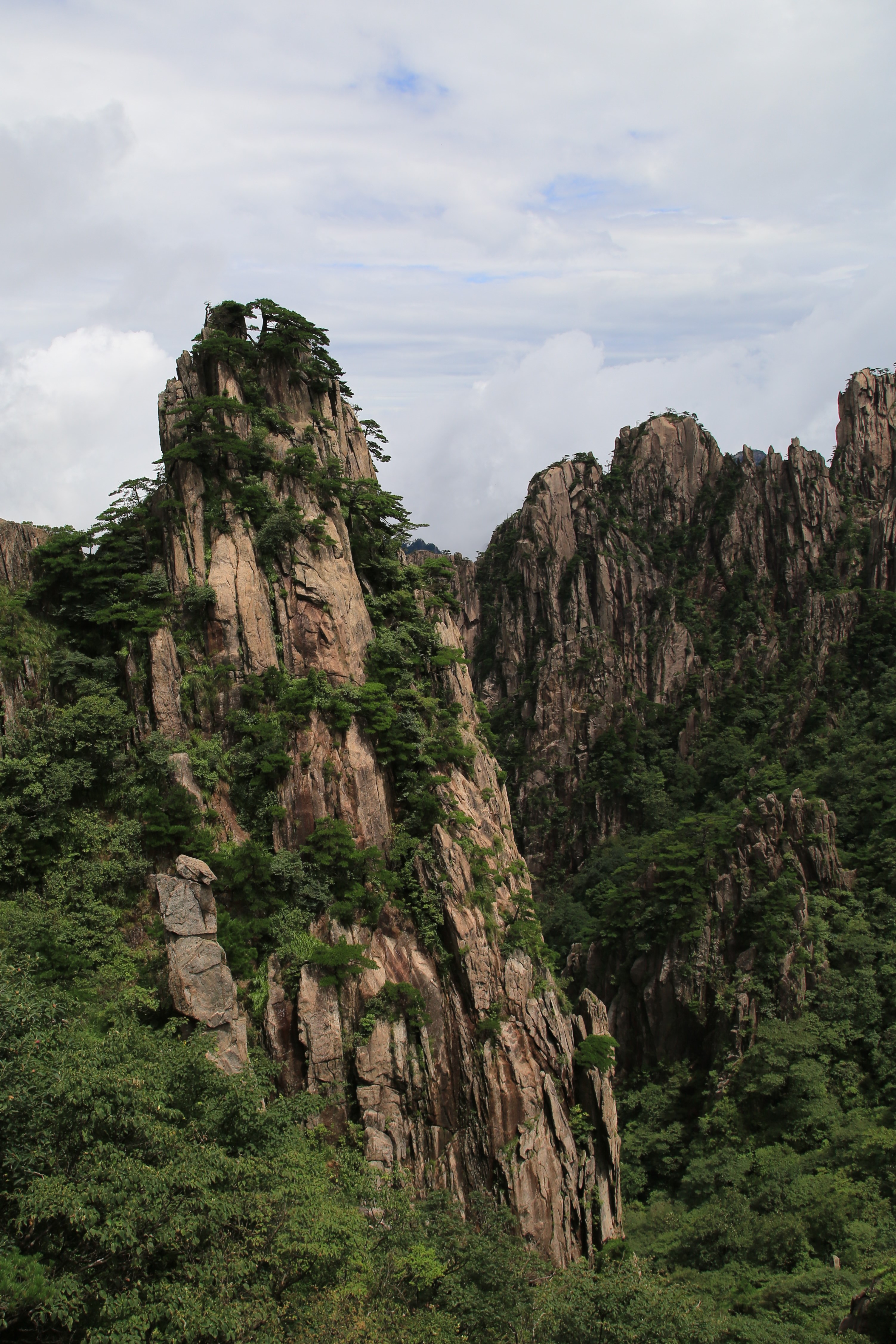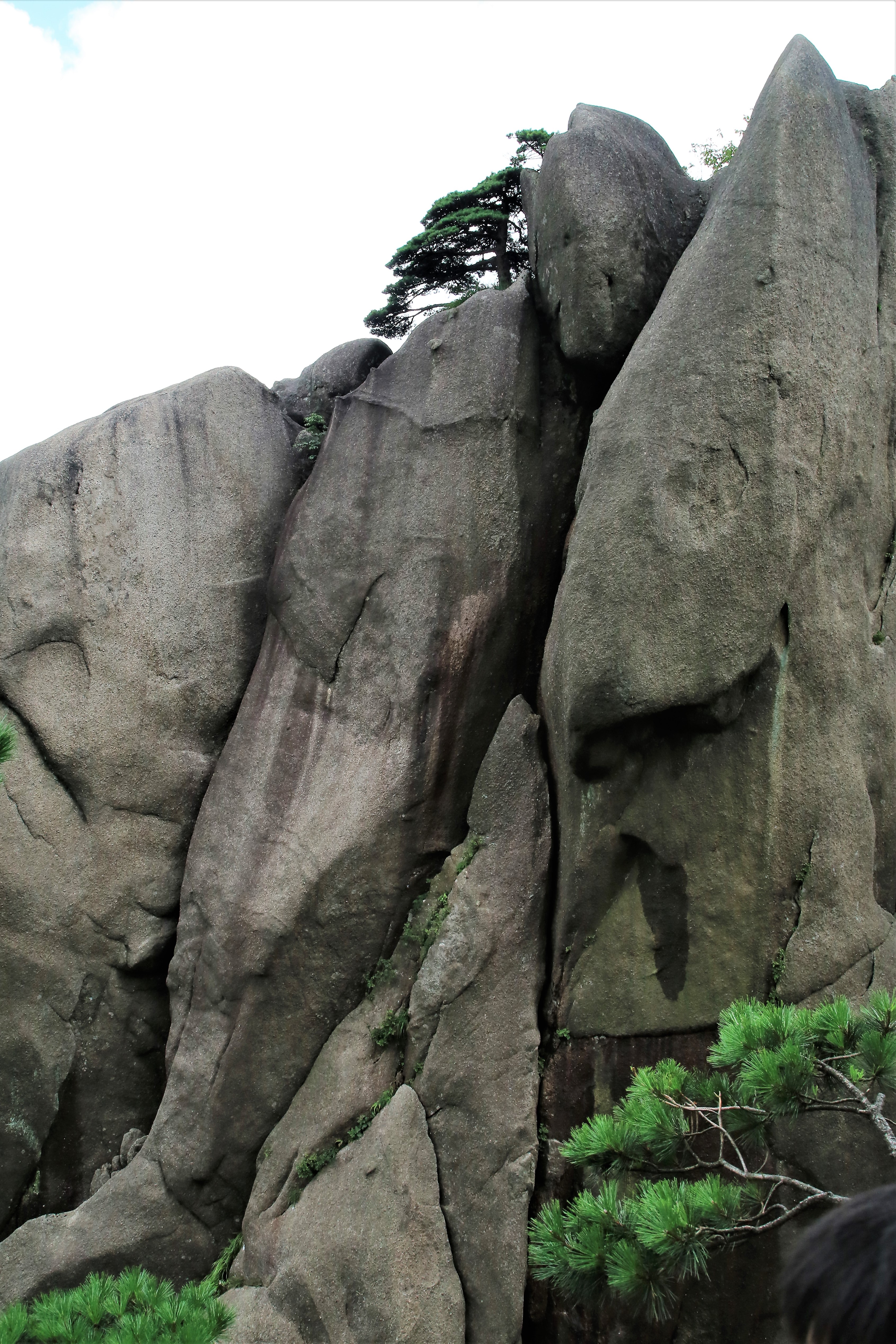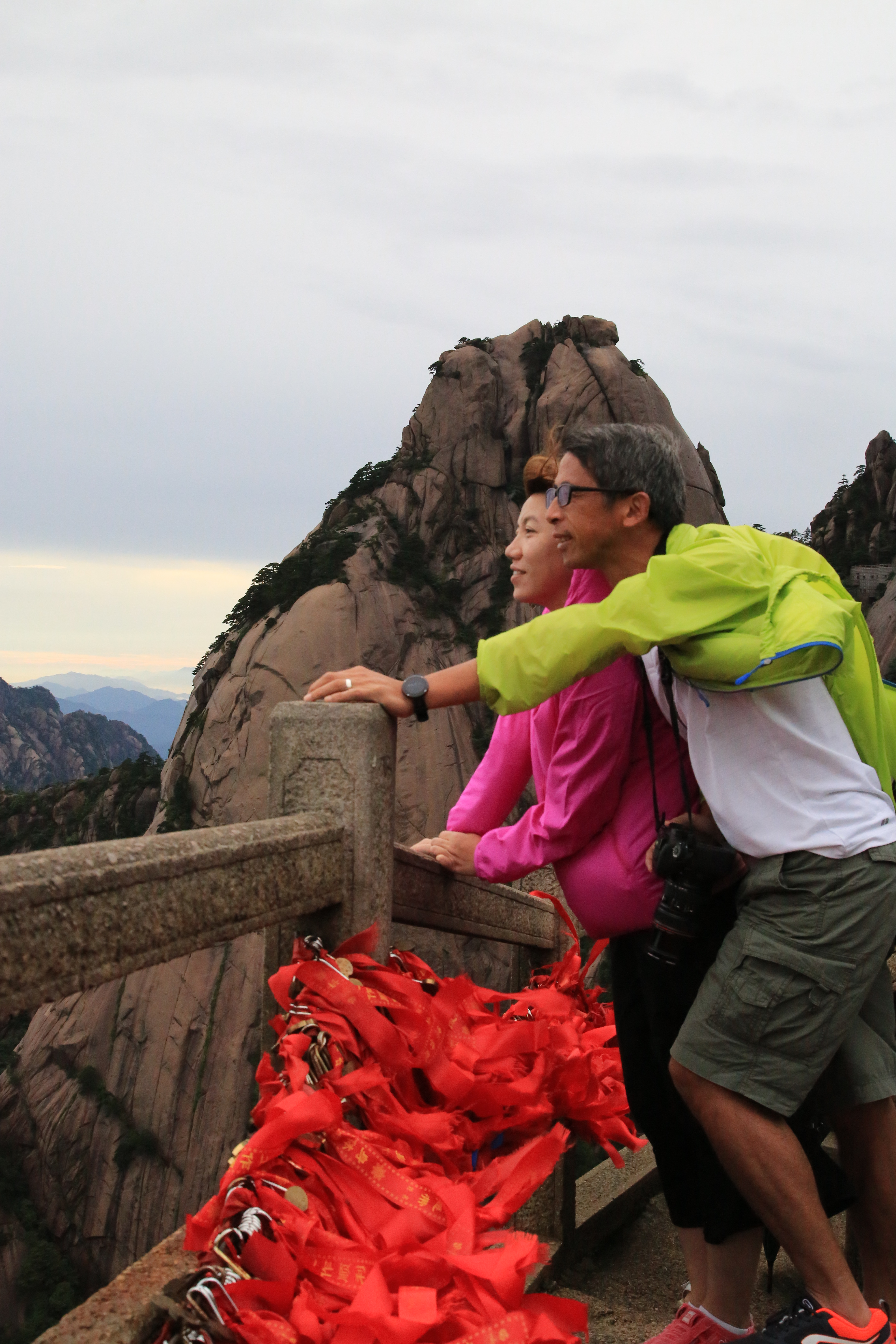 北海與西海景區:車盤旋黃山景區而上,排隊換搭雲谷索道快速抵達白鵝新站,進入▶⇝後山的北海景區,沿路遊賞始信峰、石笋矼、十八羅漢朝南海、清涼台、獅子峰…挺峭的峰林,橫生蒼勁翠綠的黃山古松,松與峰相搭天成絕色,有時巍峨獨立,有時叢叢群落,姿色萬千;然而山裡氣象也萬千,來之前還擔心黃山暴雨的訊息,未雨綢繆帶了雨具,到了景區沿途晴時多雲薄霧偶陣雨,很幸運的快接近中午,準備要回到北海賓館的路徑上,薄霧如紗漫漫籠罩,掠過散花塢的「夢筆生花」,以及獅子峰邊上的「猴子觀海」,飄至夫妻松前,山景再朦朧,絕不能錯過在連理松前,留下山盟般儷影,這一生老伴難免鬥嘴鬥氣,這時卻多一分甜美的見證,希望與松一起偕老。