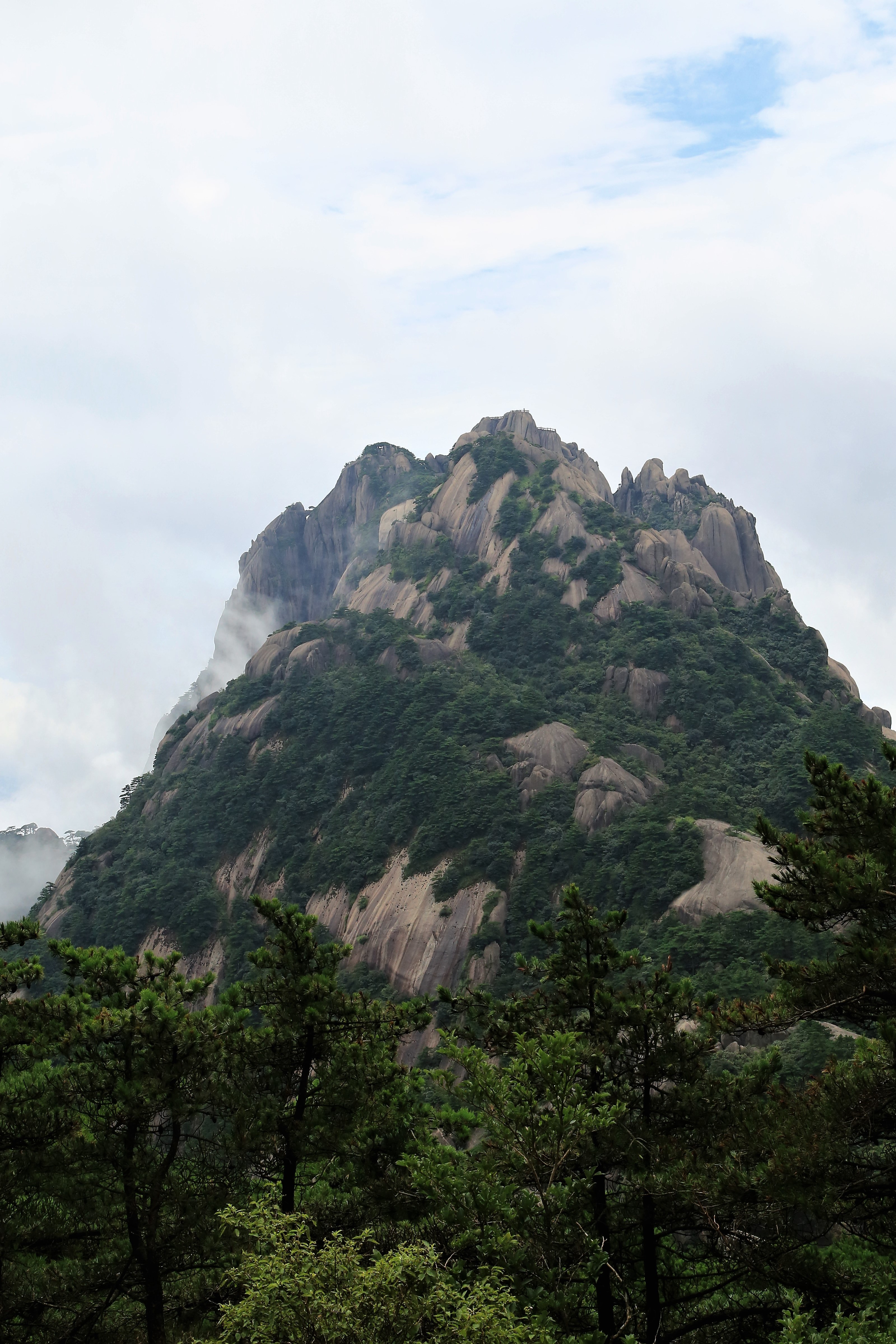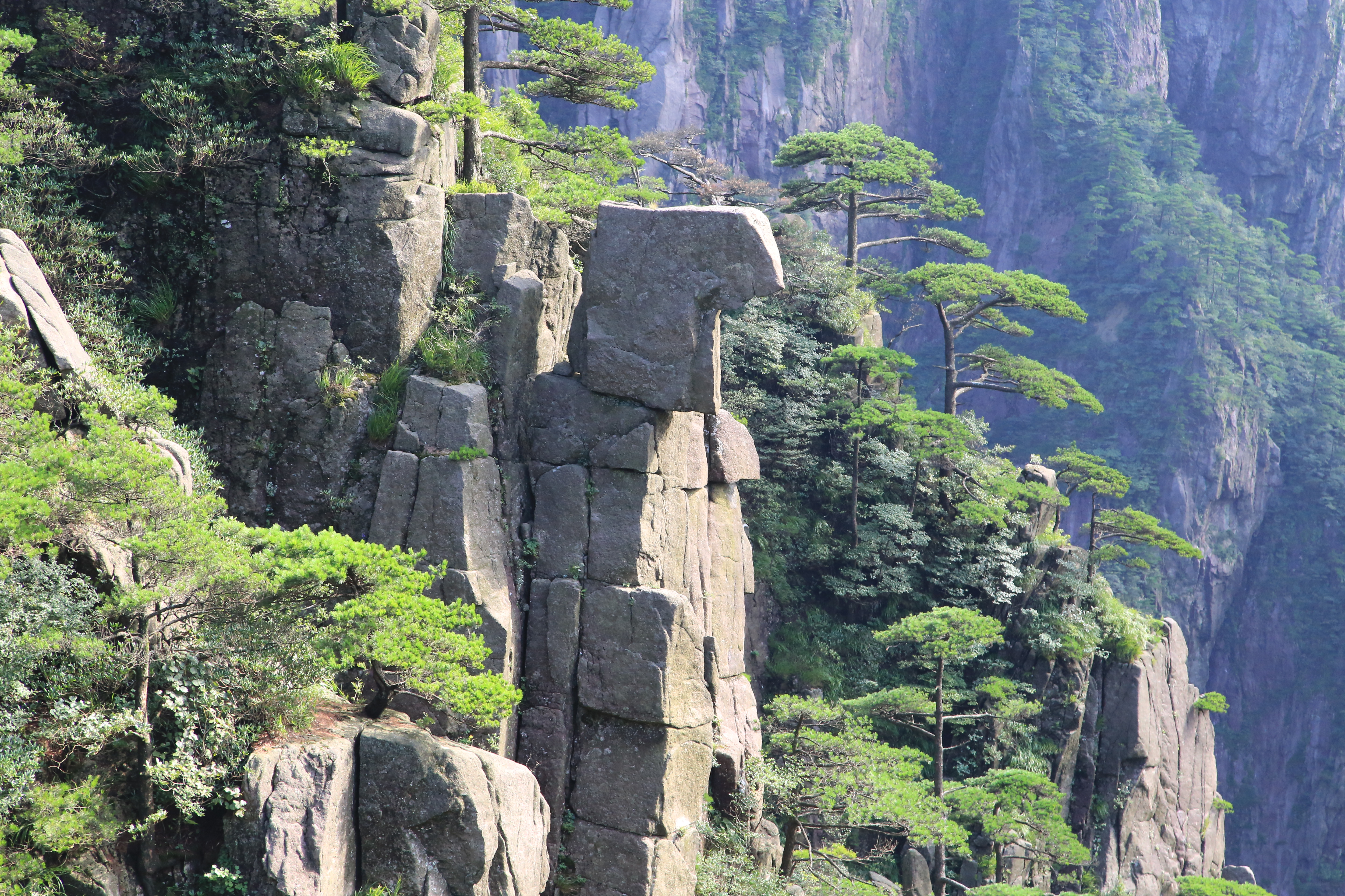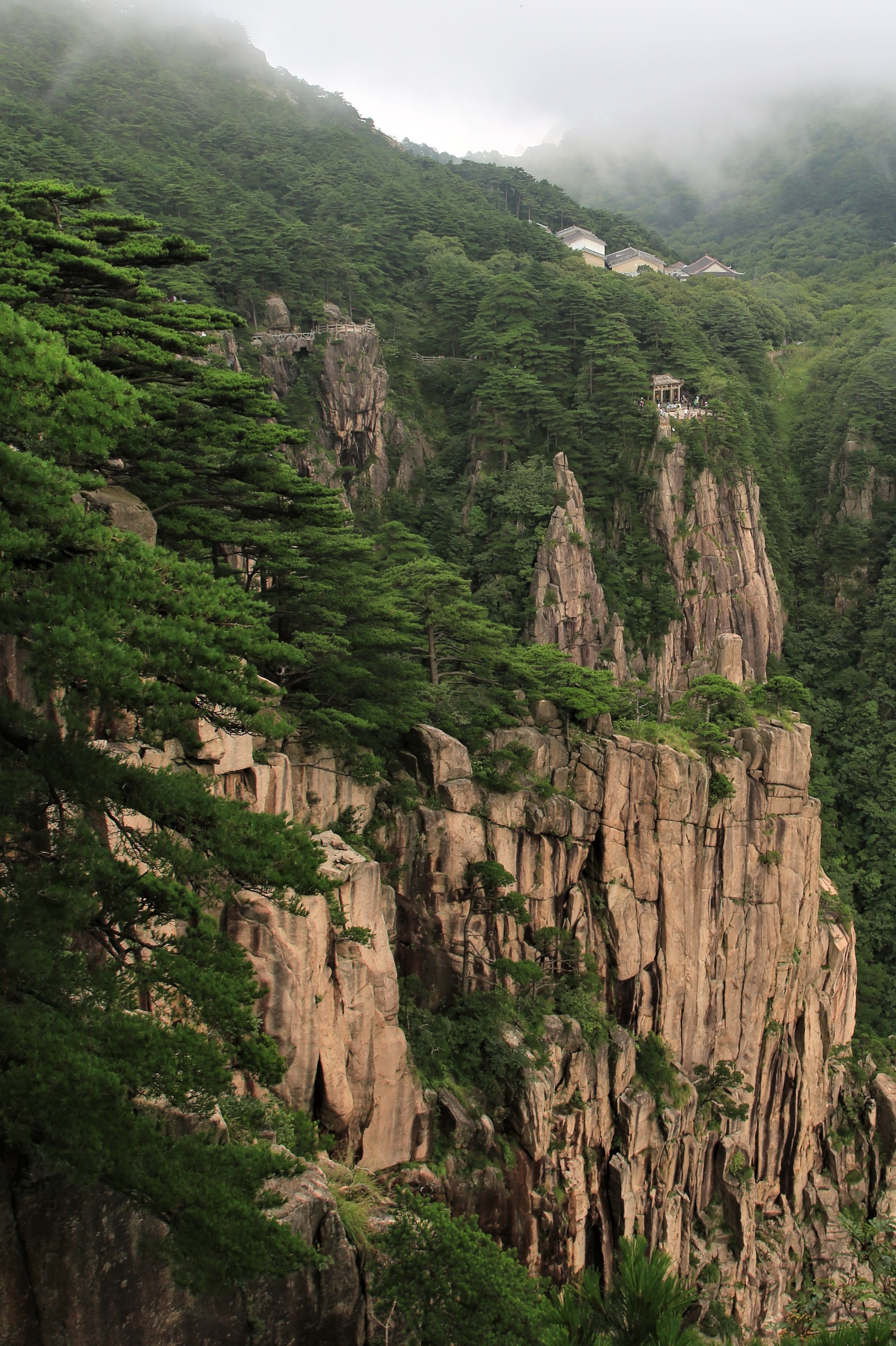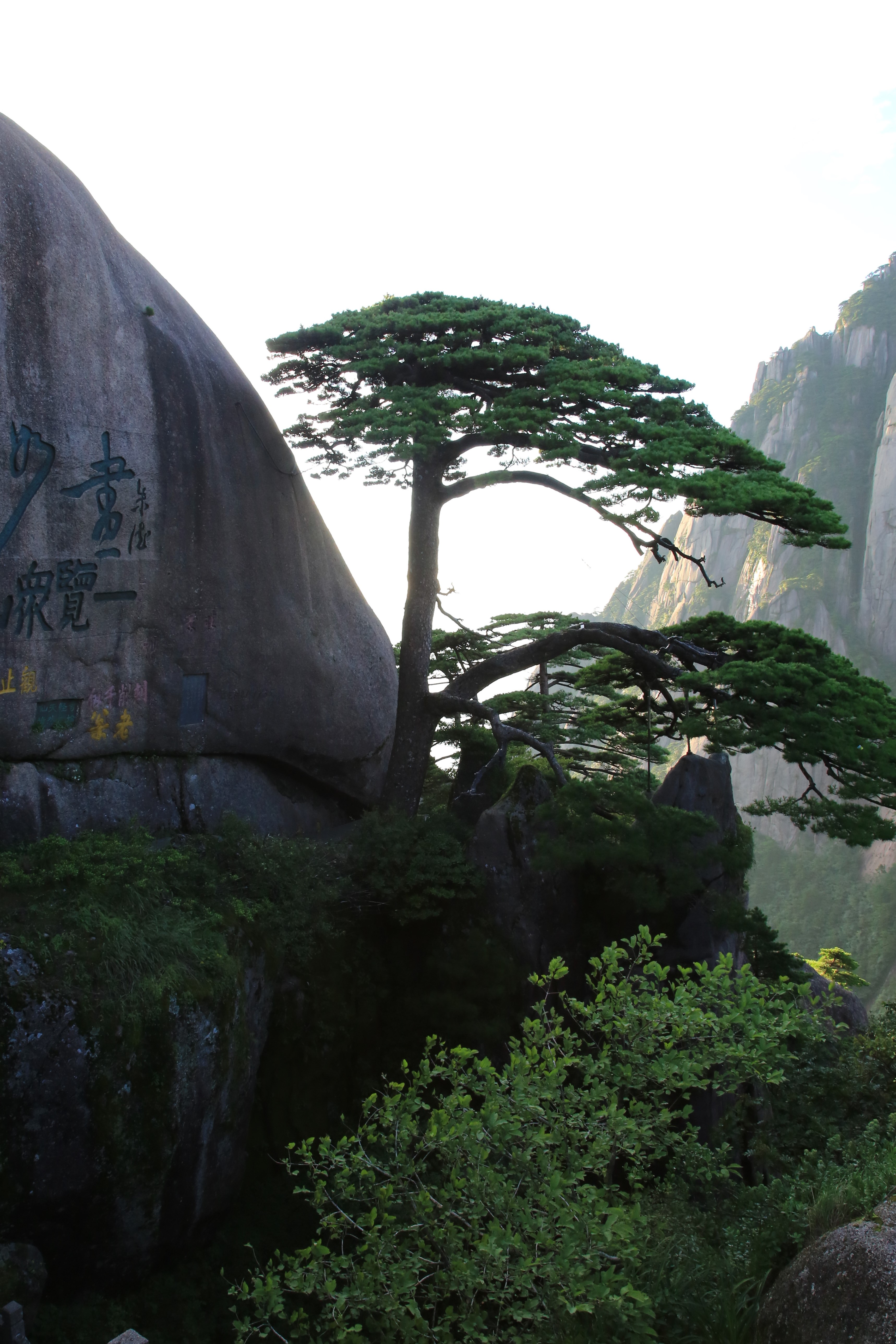 北海與西海景區:車盤旋黃山景區而上,排隊換搭雲谷索道快速抵達白鵝新站,進入▶⇝後山的北海景區,沿路遊賞始信峰、石笋矼、十八羅漢朝南海、清涼台、獅子峰…挺峭的峰林,橫生蒼勁翠綠的黃山古松,松與峰相搭天成絕色,有時巍峨獨立,有時叢叢群落,姿色萬千;然而山裡氣象也萬千,來之前還擔心黃山暴雨的訊息,未雨綢繆帶了雨具,到了景區沿途晴時多雲薄霧偶陣雨,很幸運的快接近中午,準備要回到北海賓館的路徑上,薄霧如紗漫漫籠罩,掠過散花塢的「夢筆生花」,以及獅子峰邊上的「猴子觀海」,飄至夫妻松前,山景再朦朧,絕不能錯過在連理松前,留下山盟般儷影,這一生老伴難免鬥嘴鬥氣,這時卻多一分甜美的見證,希望與松一起偕老。