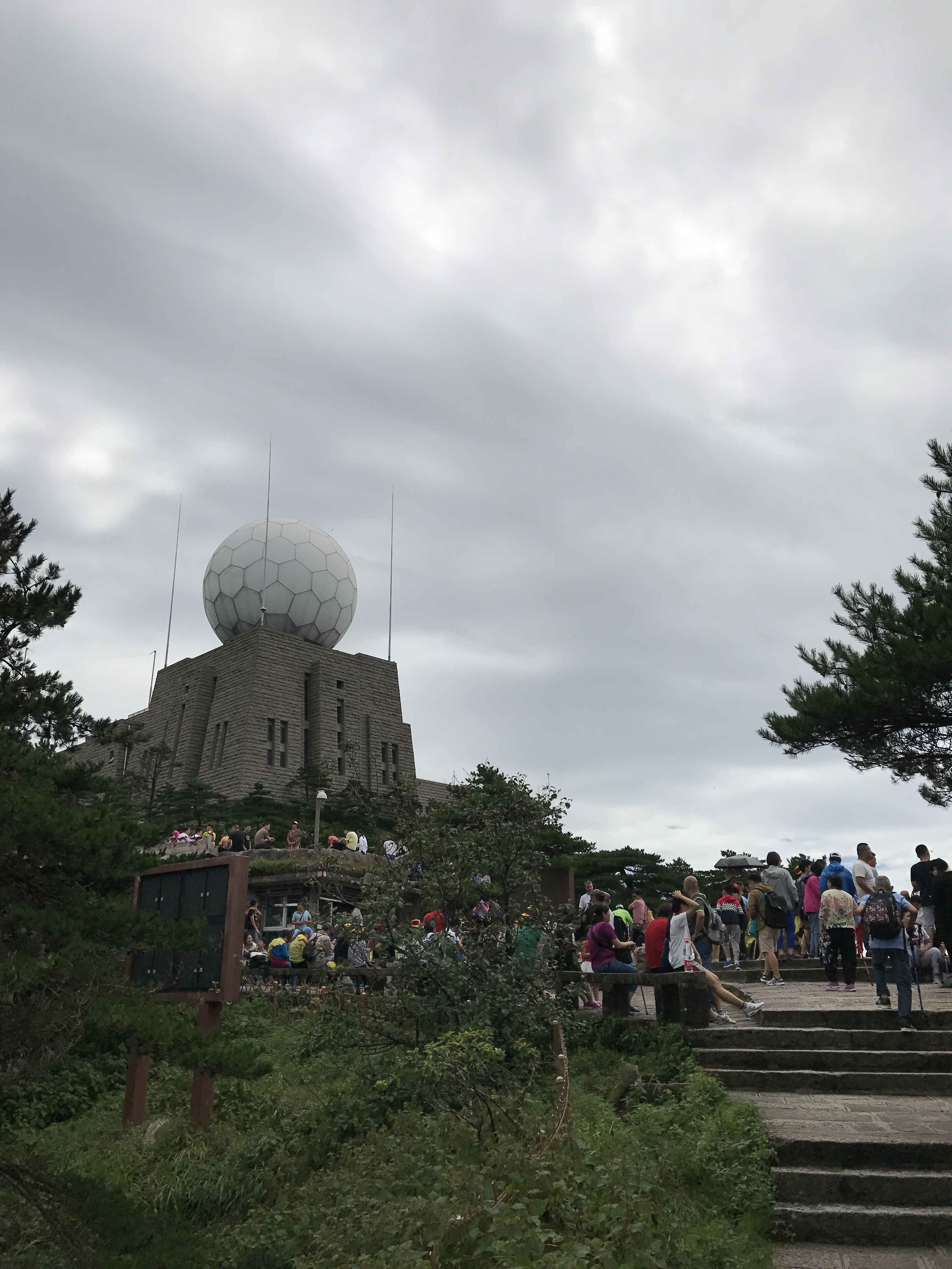 徽州人潘之恒,依照雲海形成的區域,將黃山分為東海、西海、南海(前海)、北海(後海)及天海等五海景區。這一路氣喘吁吁上山,在迷霧裡終於登上▶⇝黃山第二高峰光明頂(1860米),從這裡可以觀賞:黃山主峰蓮花峰(海拔1864米)、天都峰(1810米)、鰲魚峰等36峰。因此,天海景區視野遼闊,最醒目的莫過於光明頂的氣象台,白色的球型雷達,遠遠就映入眼簾。放下背包走支線看飛來石景點,由於霧氣瀰漫,只見巨石紋風不動矗立著,回程時天氣乍晴,回望群峰競秀,氣勢磅礡。