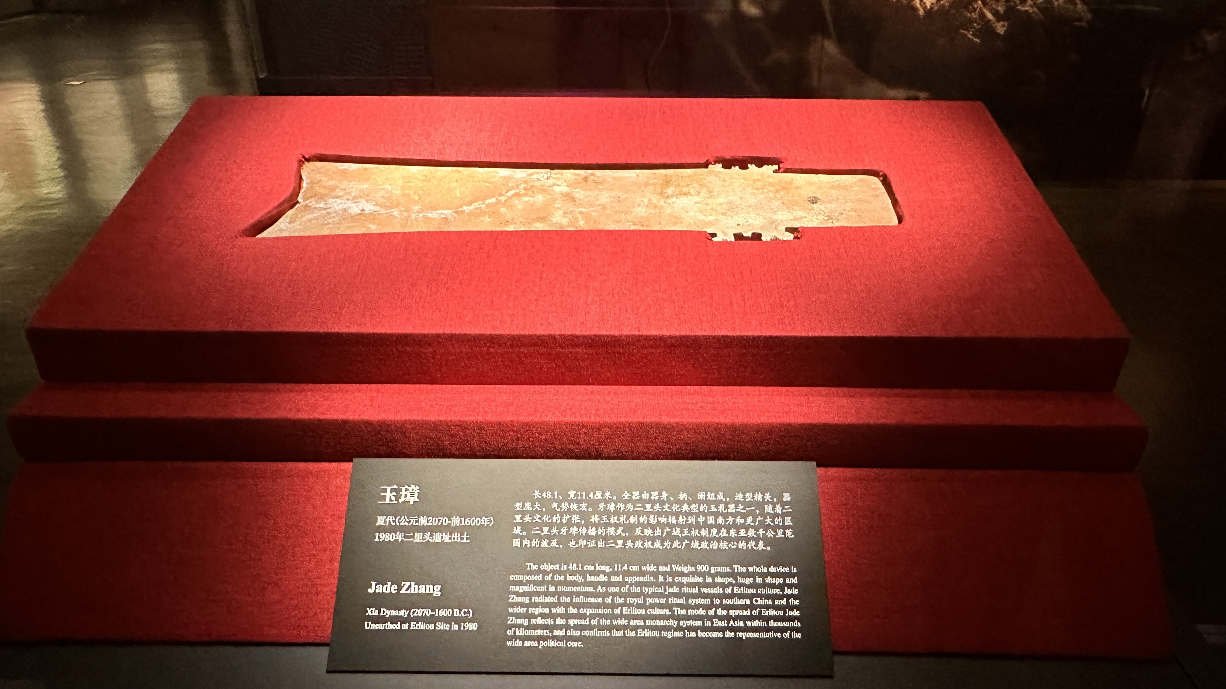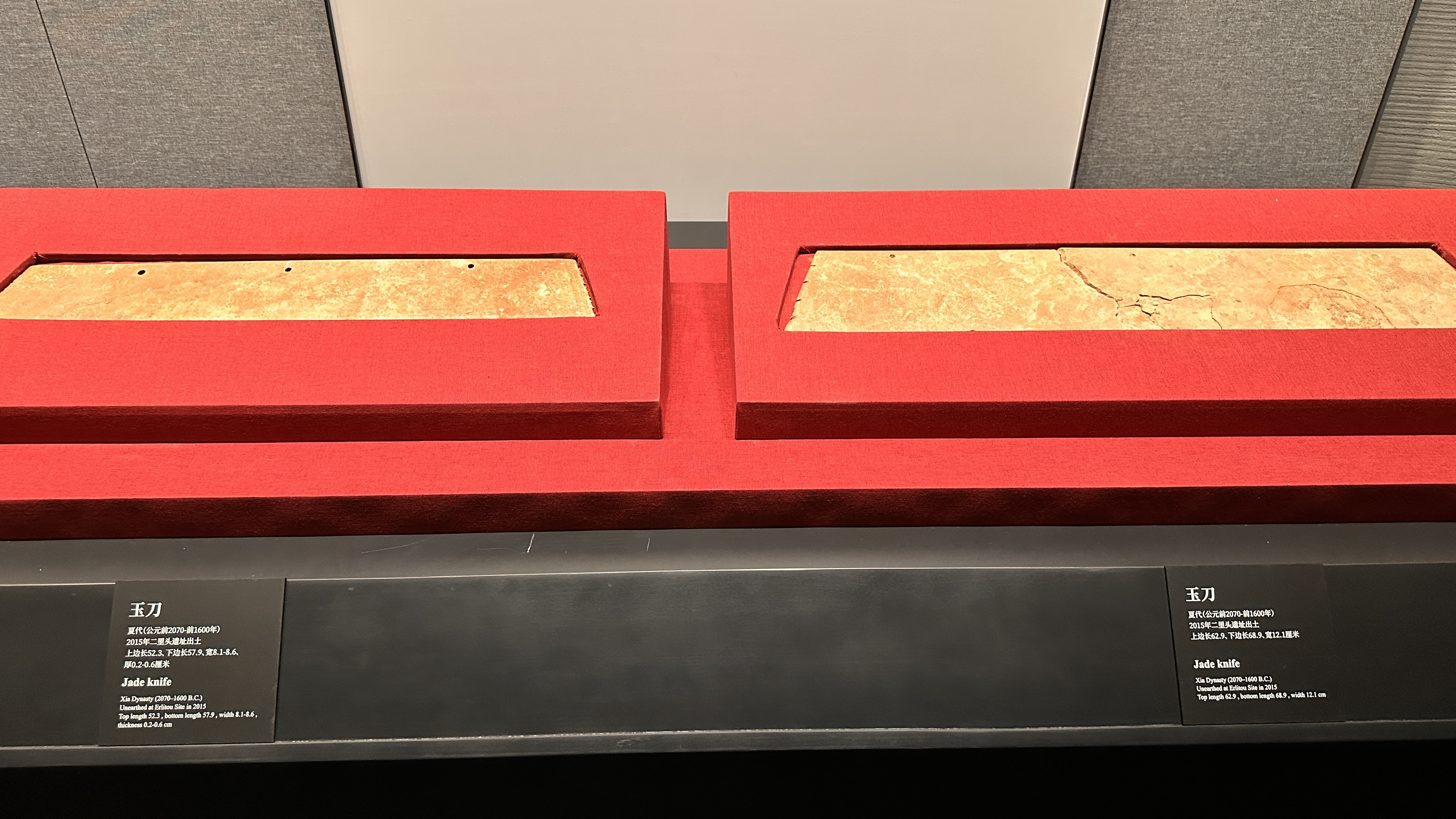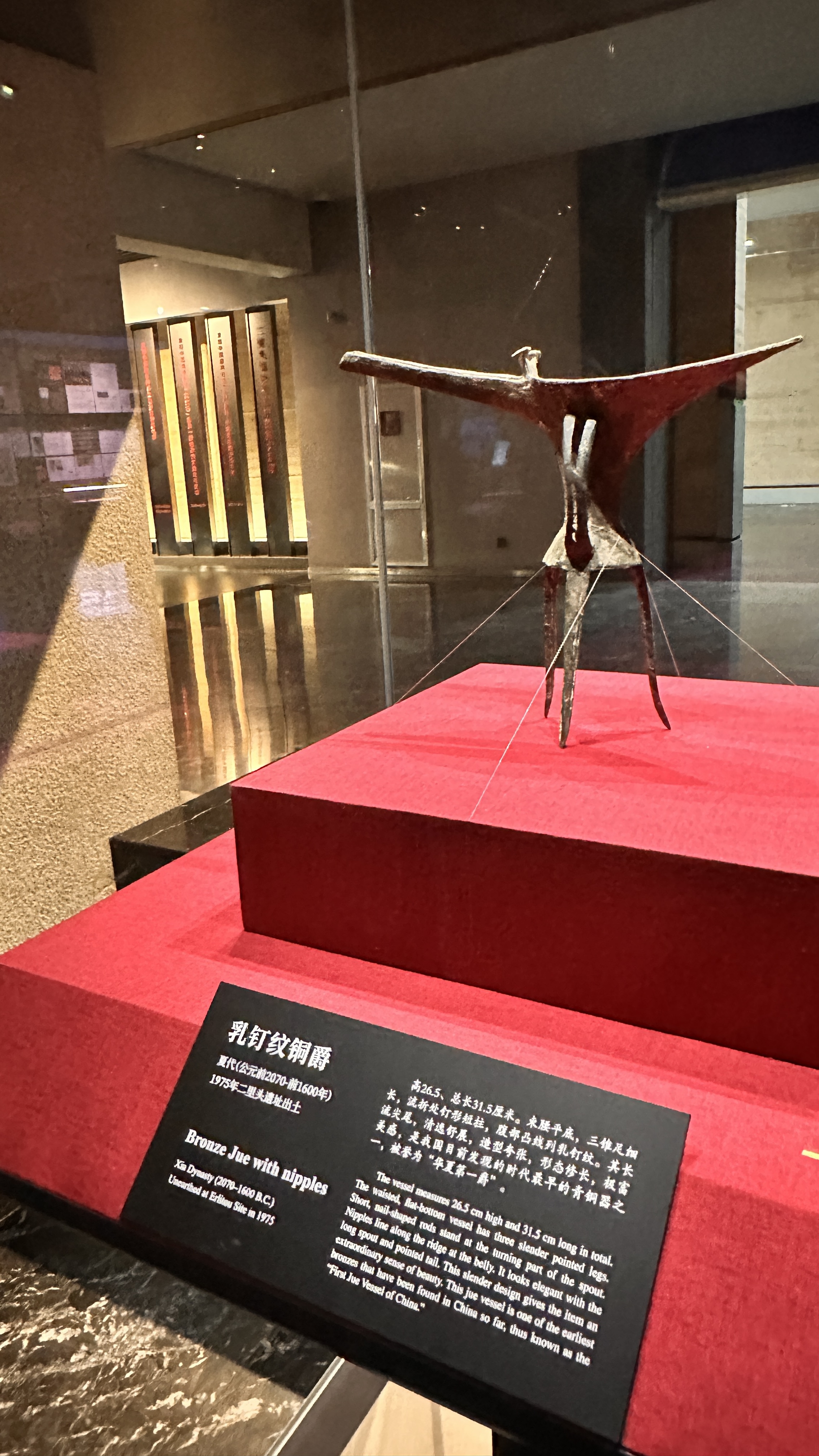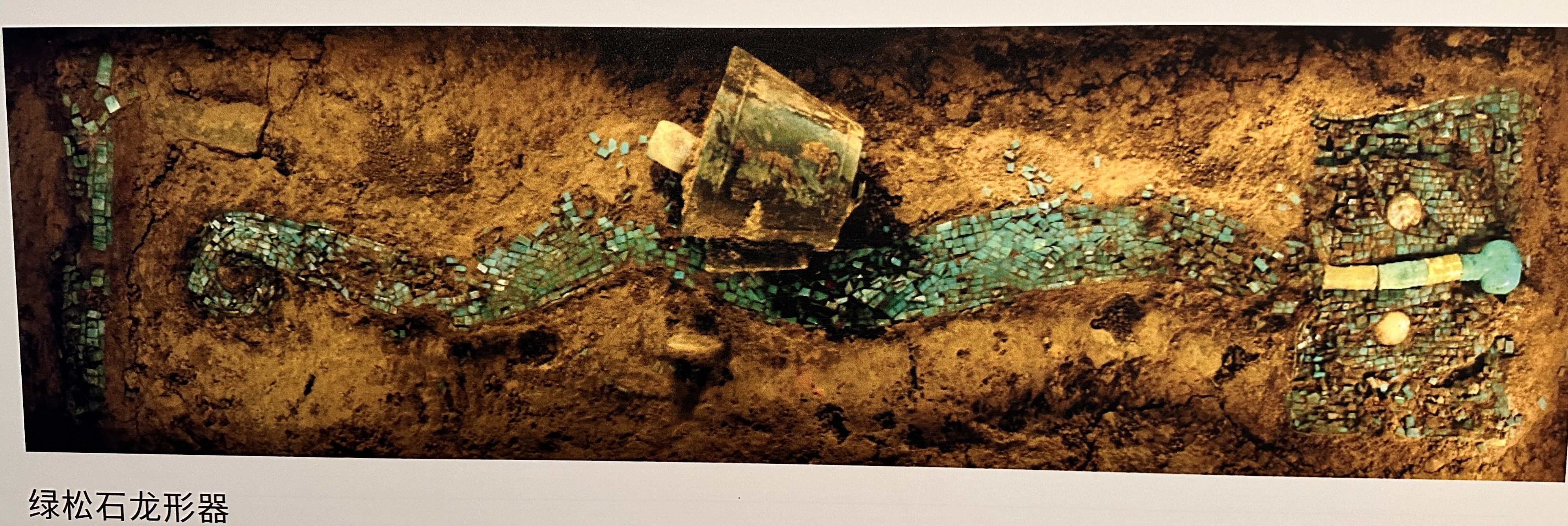 ▶⇝綠松石龍:找不到真品借用展版上圖片說故事:這件稀世珍品,是由2000餘片的綠松石片組合而成龍形,龍首呈現蒜頭狀鼻端,兩側切出對稱的眼眶輪廓,梭形眼,輪廓線富於動感,龍身略呈波狀曲伏,中脊,近尾部漸變為圓弧隆起,尾尖內蜷,若游動狀。▶⇝乳釘紋青銅爵:長流尖尾、束腰平底、三錐足細長,槽狀長流,流折處有釘形短柱,腹部凸線列乳釘紋。整體清逸舒展,極富美感,是目前所發現最早的青銅容器之一。▶⇝七孔玉刀:肩窄刃寬、梯形兩側各有對稱的扉牙、紋飾以交叉的直線陰紋組成網狀和幾何圖形;刀背處有等距且排成一條直線的七個圓孔。迄今為止是二里頭遺址出土的最大的一件玉器。