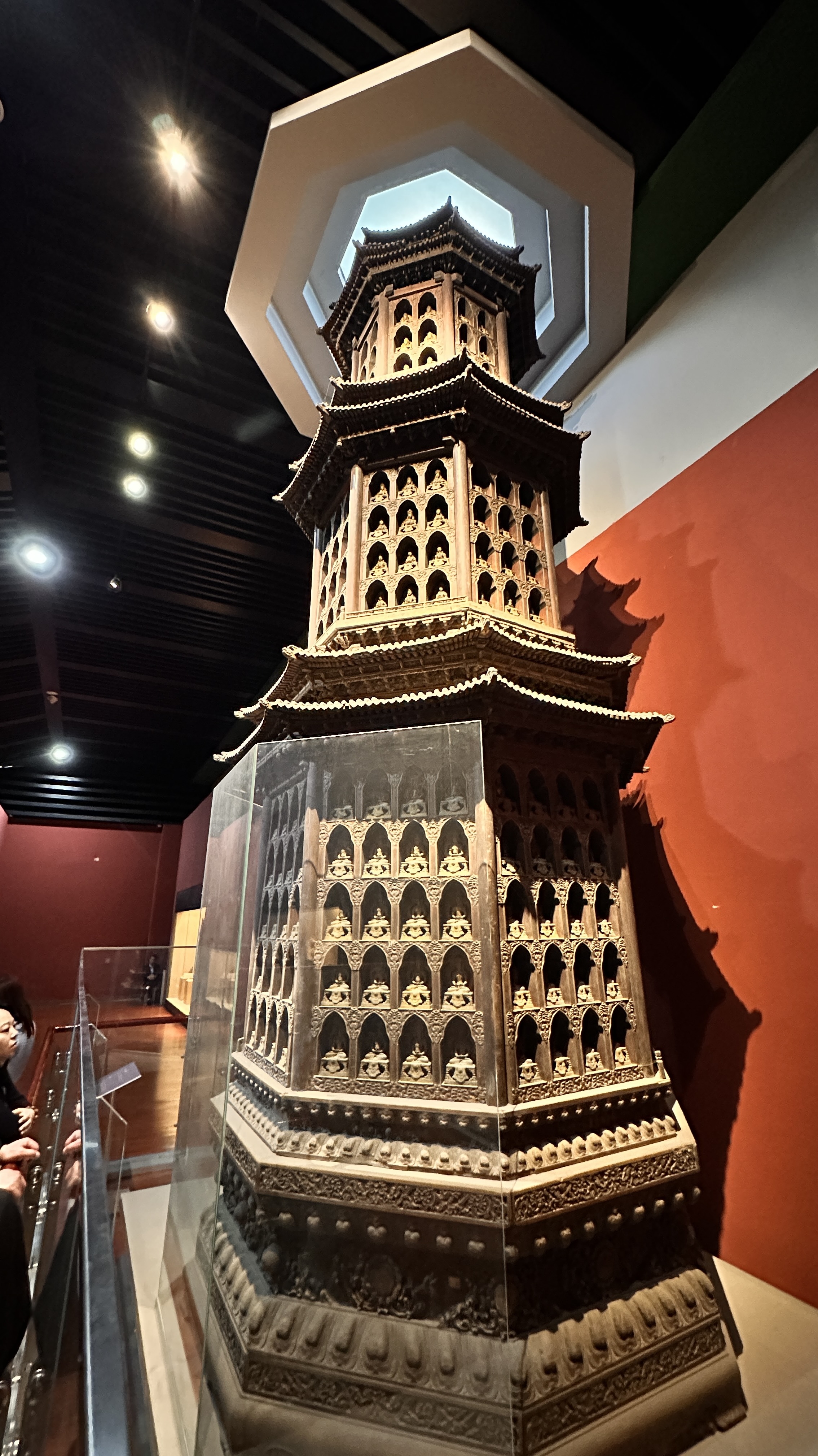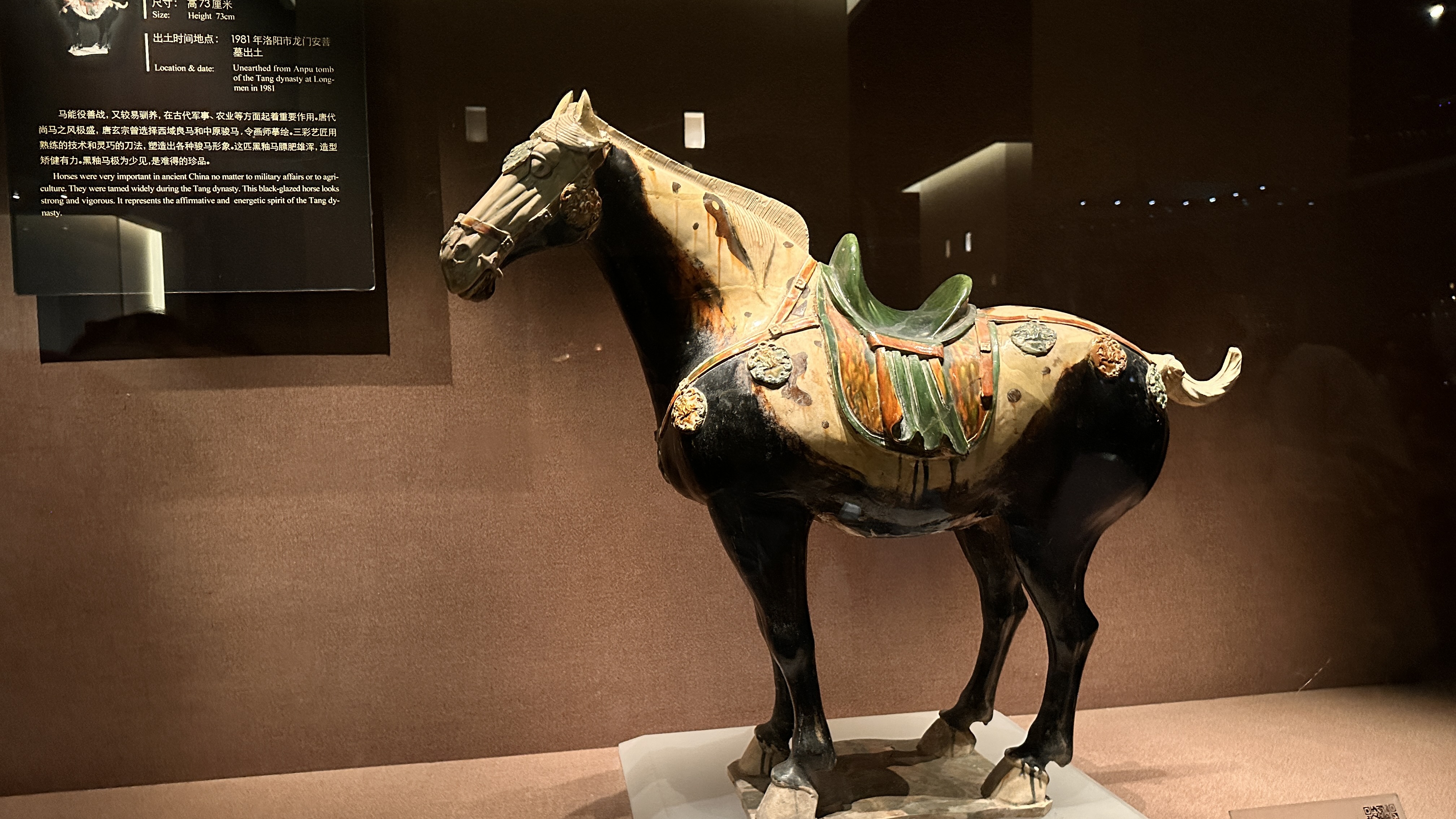 ▶⇝三彩黑釉馬:三彩陶典型代表,黑釉馬不僅在脖頸、四肢、腹臀部施以黑釉,因為珍稀目前僅存兩件,極具藝術價值。▶⇝石辟邪:造型流暢生動,姿態自信豪邁,是東漢墓葬石刻的精品。▶⇝曹魏白玉杯:採用精美的羊脂白玉雕琢,玉質溫潤,曲線流暢,優雅樸素,顯現出超凡脫俗的大氣。▶⇝商代母鼓方罍:銘文中的「母」字是稱謂關係,「鼓」可能與紋飾或功能相關,通體飾有複雜的龍紋、雲雷紋及垂葉紋。見證了中原文明在青銅時代的技術傳播與文化融合。▶⇝北魏泥塑佛面像:出土於永寧寺遺址,經歷火災淬煉成陶像,僅存的半面佛像,表情慈祥、舒展沉穩,嘴角微微上翹,是浴火涅槃後的從容,被譽為「殘缺的慈悲」。▶⇝金絲楠木塔:是珍貴的金絲楠木雕刻而成。塔身有兩百四十四個佛龕,每座龕內均供奉著一尊銅染金無量壽佛。